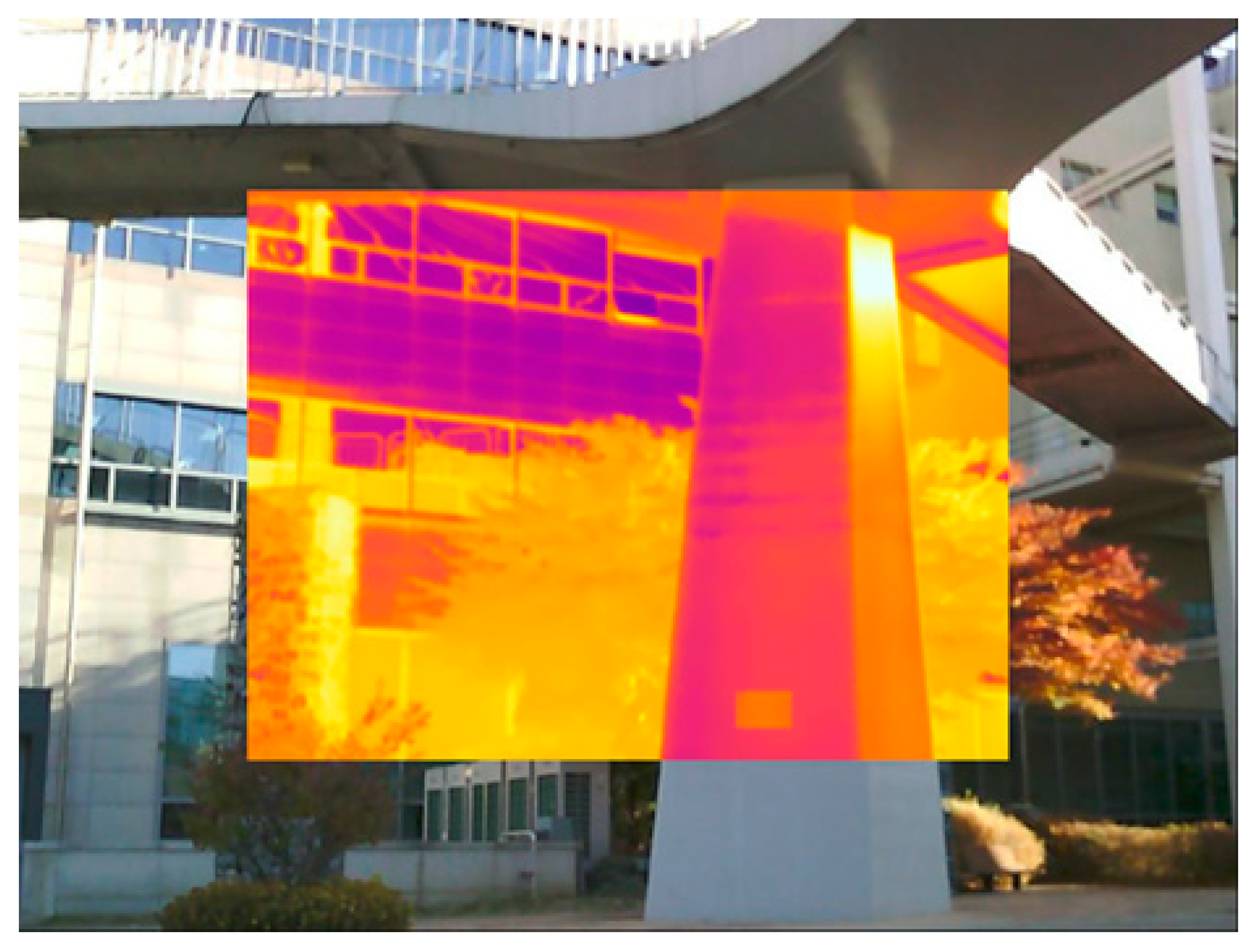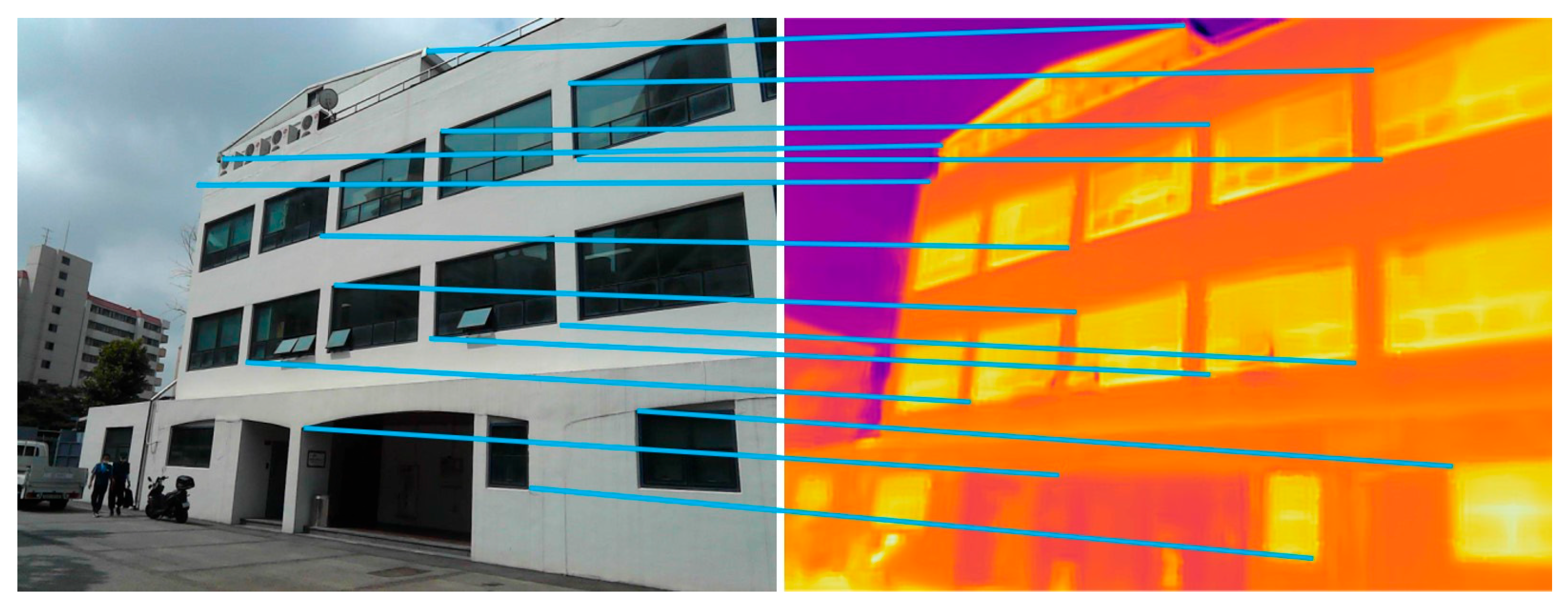 This section establishes the image processing framework required for diagnosing thermal insulation performance in building envelopes using infrared (IR) thermography. Conventional single-frame IR images lack spatial continuity and therefore cannot provide a comprehensive assessment of façade conditions. To overcome this limitation, the proposed framework integrates four modules: (1) IR–visible image alignment and correction, (2) panoramic thermal reconstruction, (3) semantic segmentation of envelope components, and (4) quantitative surface temperature–based diagnosis.