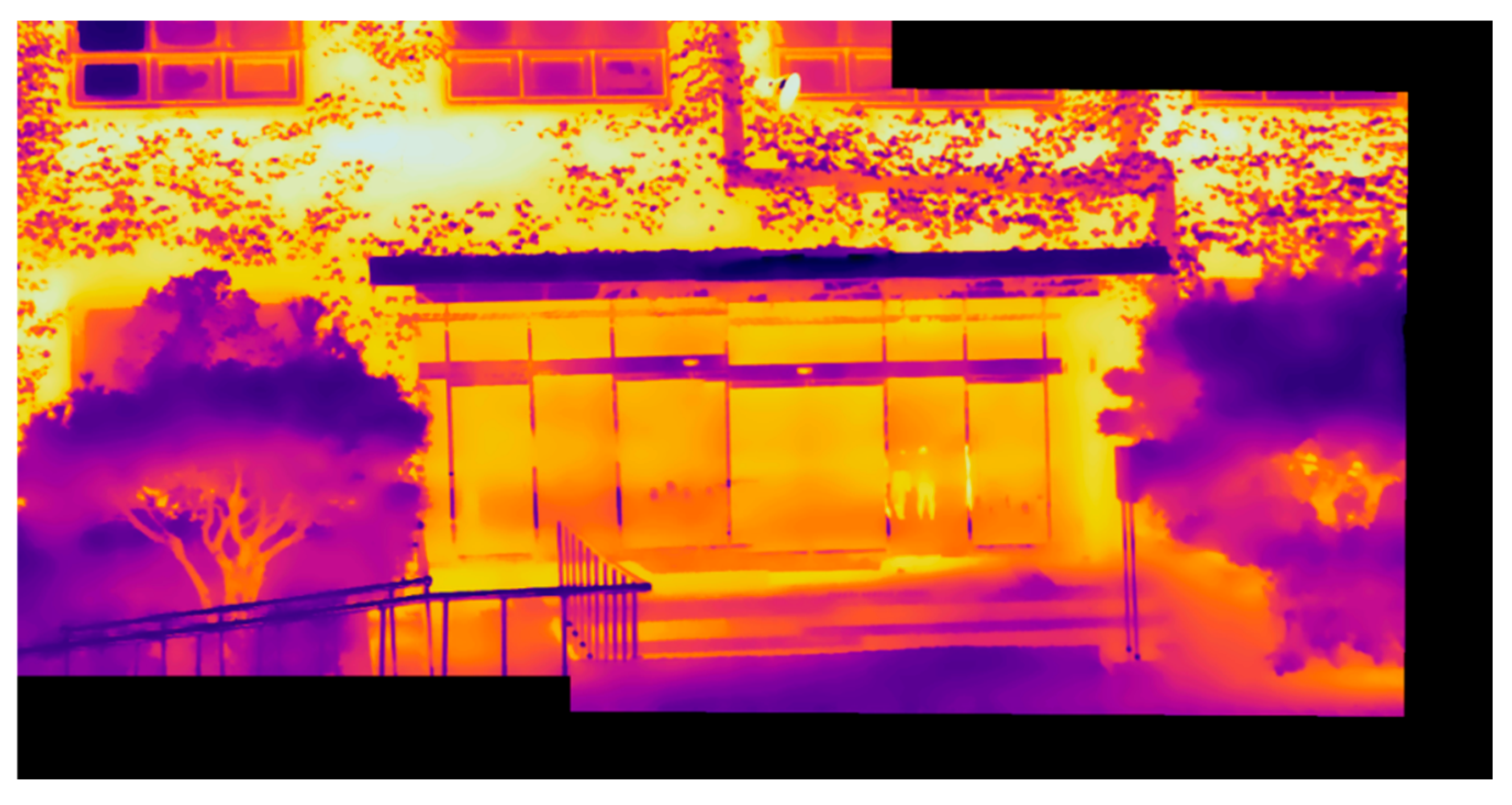 Conventional diagnostic methods, such as heat flow meters, blower door tests, and U-value calculations, provide useful insights but are limited in scalability and practicality. They often require interior access, specialized equipment, and localized measurements, making them unsuitable for large or complex buildings. Infrared thermography (IR) offers a non-invasive alternative by visualizing surface temperature distributions, yet standalone IR imaging lacks spatial continuity and is highly sensitive to environmental conditions, reducing diagnostic reliability [