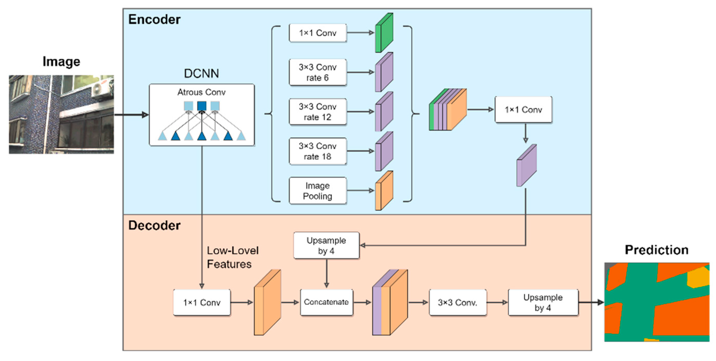 13], which combines atrous convolution with an encoder–decoder structure to capture both global context and fine boundary details. The architecture of the model is presented in