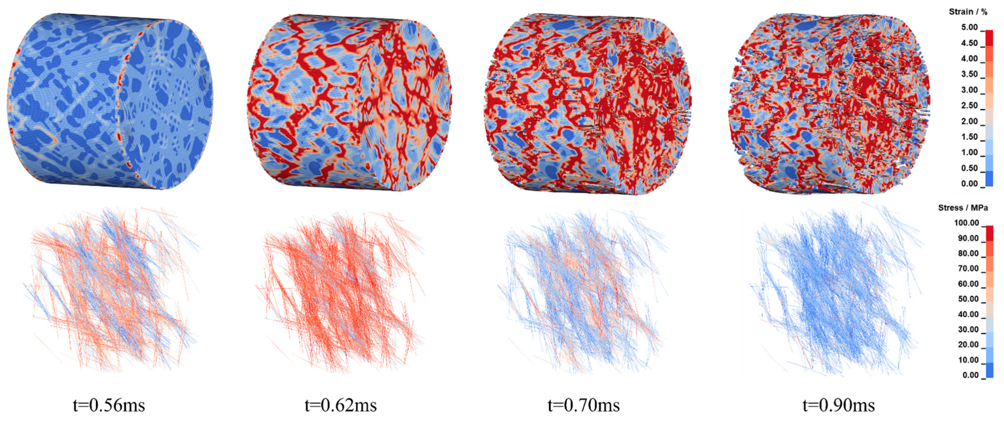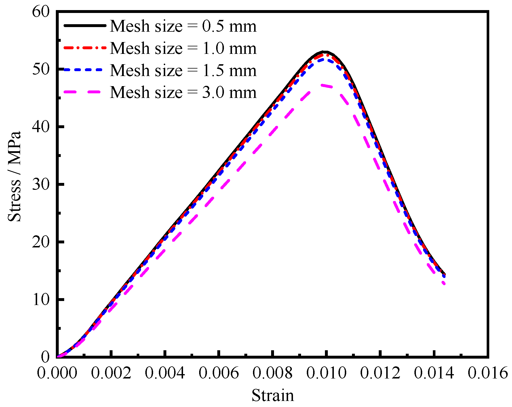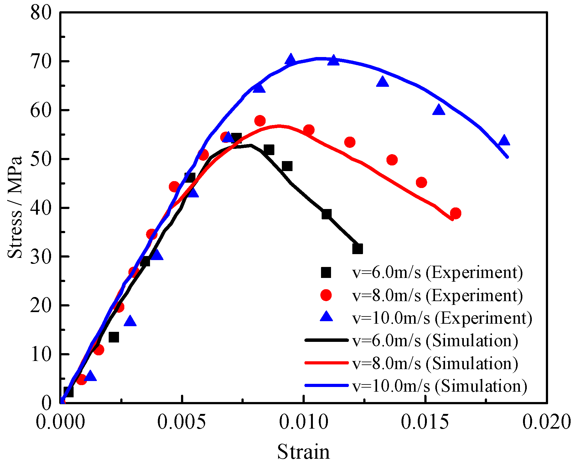 - The simulated results exhibit close agreement with the experimental data in terms of peak stress, peak strain, and failure characteristics.