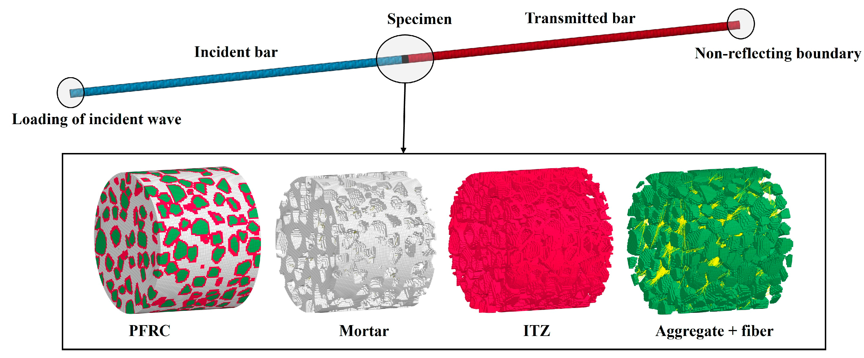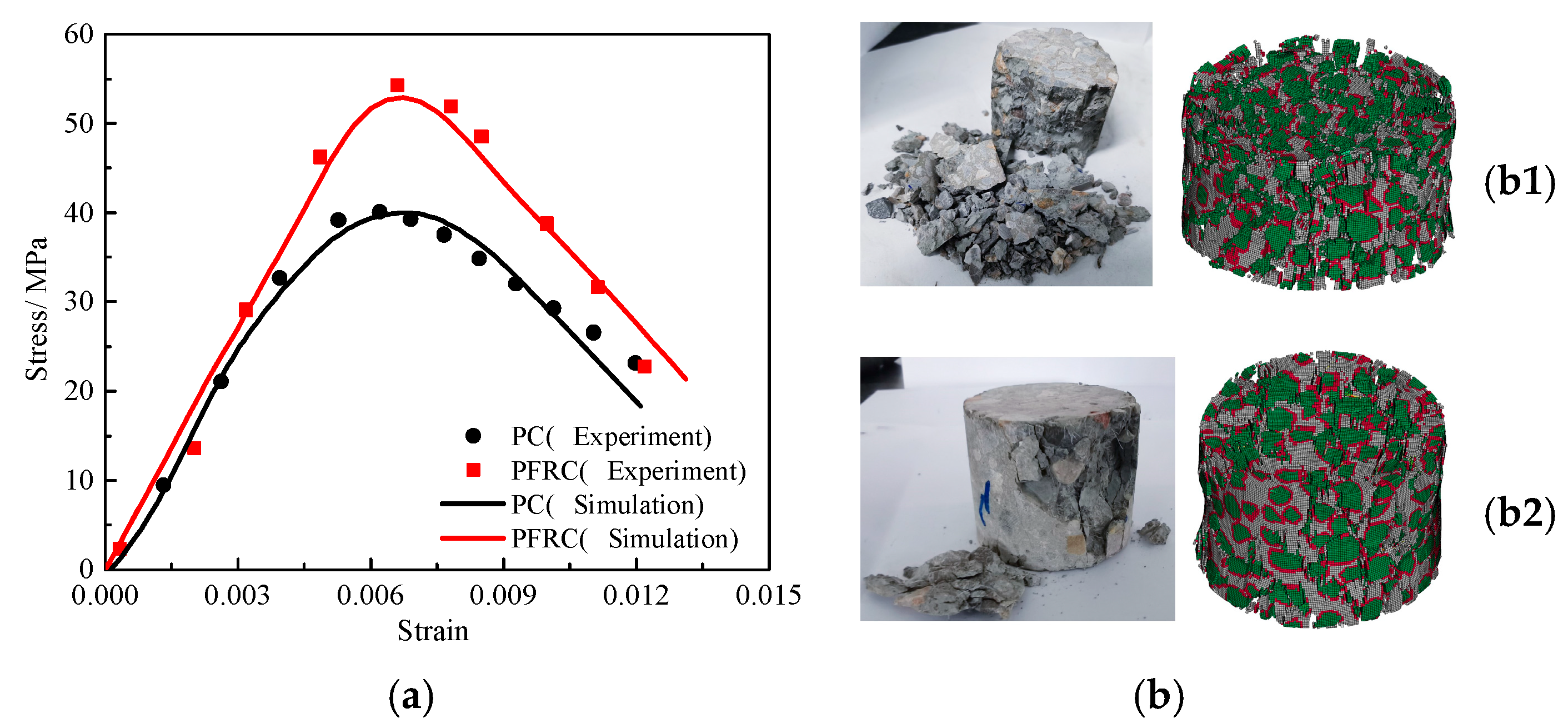 - Liu, L.; Cai, Y.; Chen, X.; Liang, J.; Xu, Z. Study on high temperature dynamic characteristics and mesoscopic simulation of HFRC under dynamic and static combined loading. Structures 2024, 60, 105824. [Google Scholar] [CrossRef]