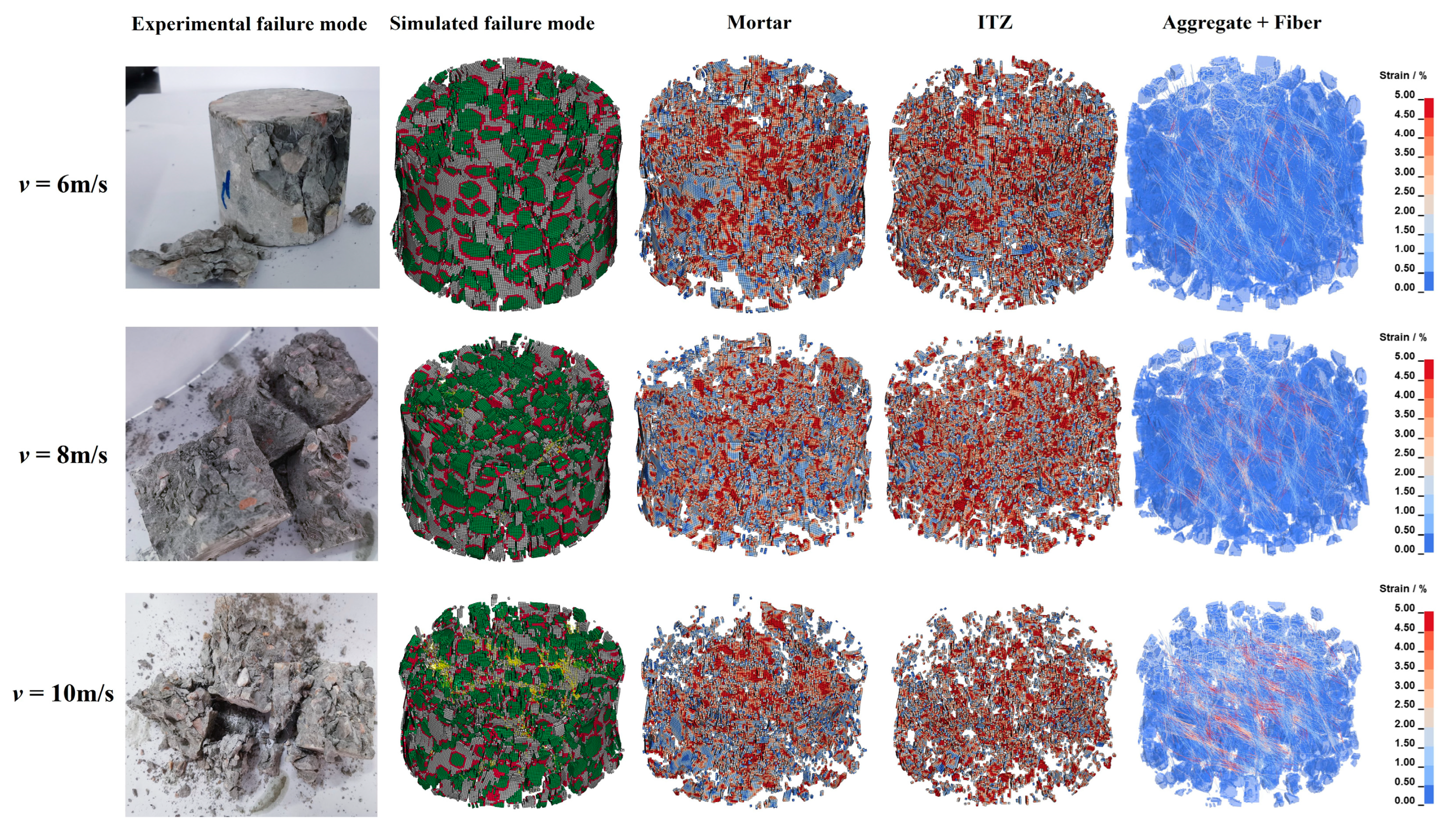 - As the impact velocity increased, the aggregates exhibited limited damage. Cracking primarily initiated and propagated through the mortar and the ITZ. Concurrently, the stress sustained by the polypropylene fibers also increased with the higher impact velocity.