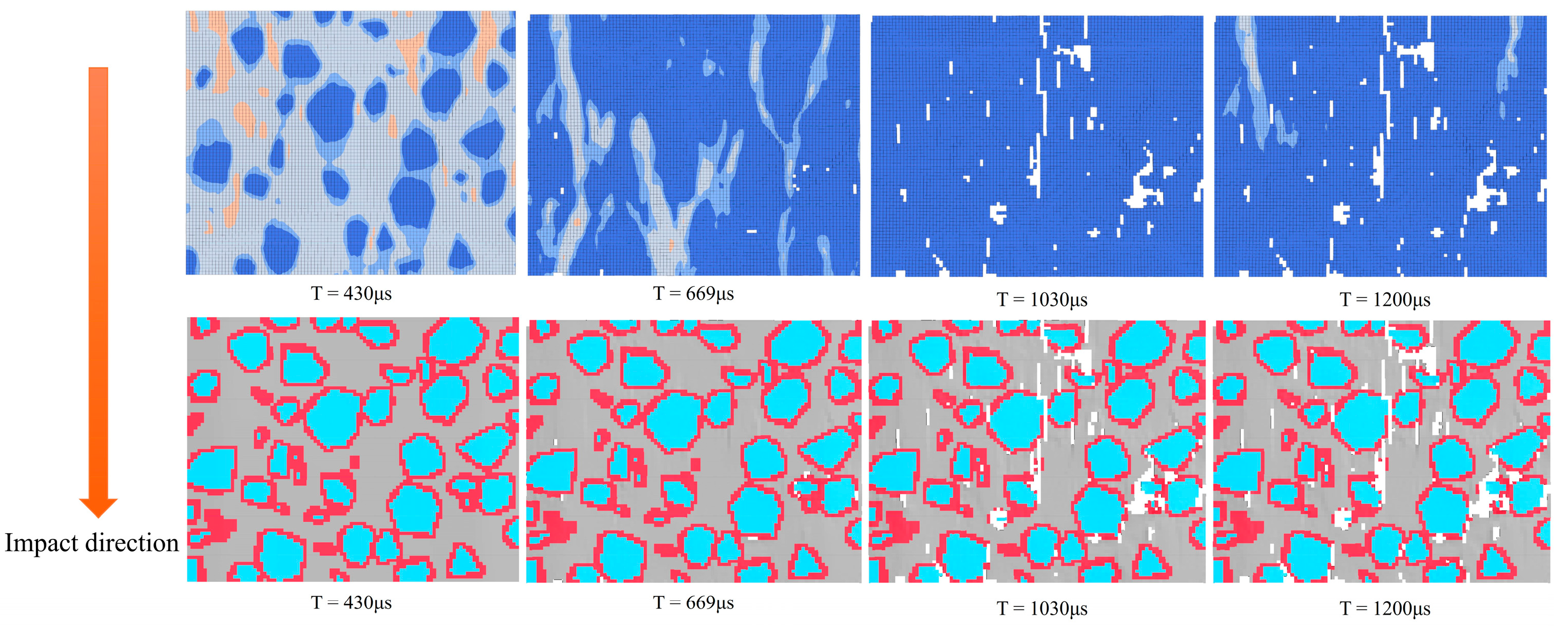 - Zhang, X.; Cheng, Y.; Wu, H. Analysis on dynamic compressive behavior of concrete based on a 3D mesoscale model. Explos. Shock. Waves 2024, 44, 55–71. [Google Scholar] [CrossRef]