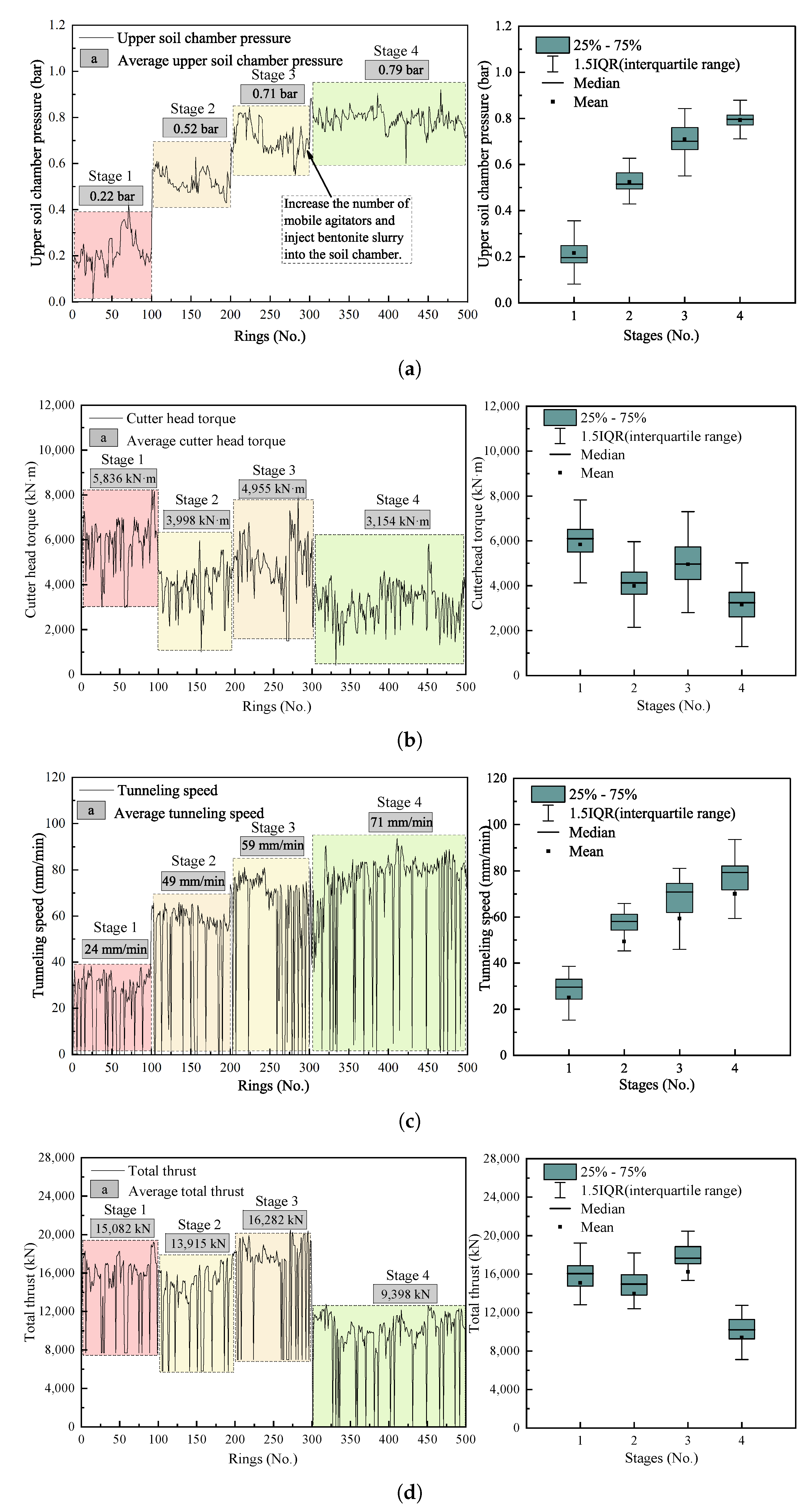 | Test Stage | Length (Rings) | Number of Mobile Agitators | Bentonite Injection Volume | Foam Injection Volume | Upper Soil Chamber Pressure | Average Cutterhead Torque | Average Tunneling Speed | Average Total Thrust |