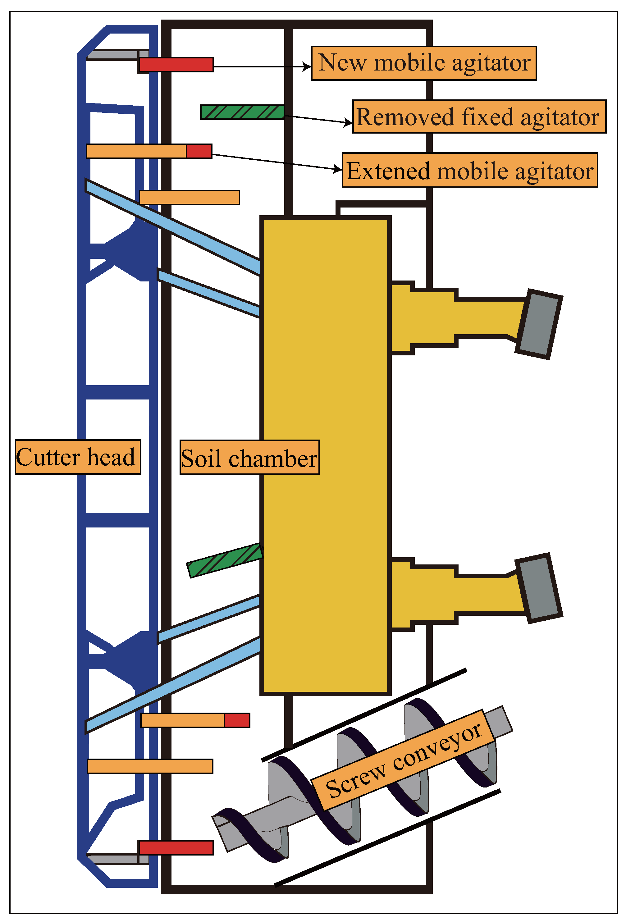 - Given the same soil conditioning agent injection ratios, optimizing the shield mixing system increased the pressure in the upper soil chamber by 11.3%, decreased the torque on the cutterhead by 36.9%, and decreased the total thrust by 42.3%. Thus, improving the mixing capacity of the soil chamber can effectively improve the effects of soil conditioning.