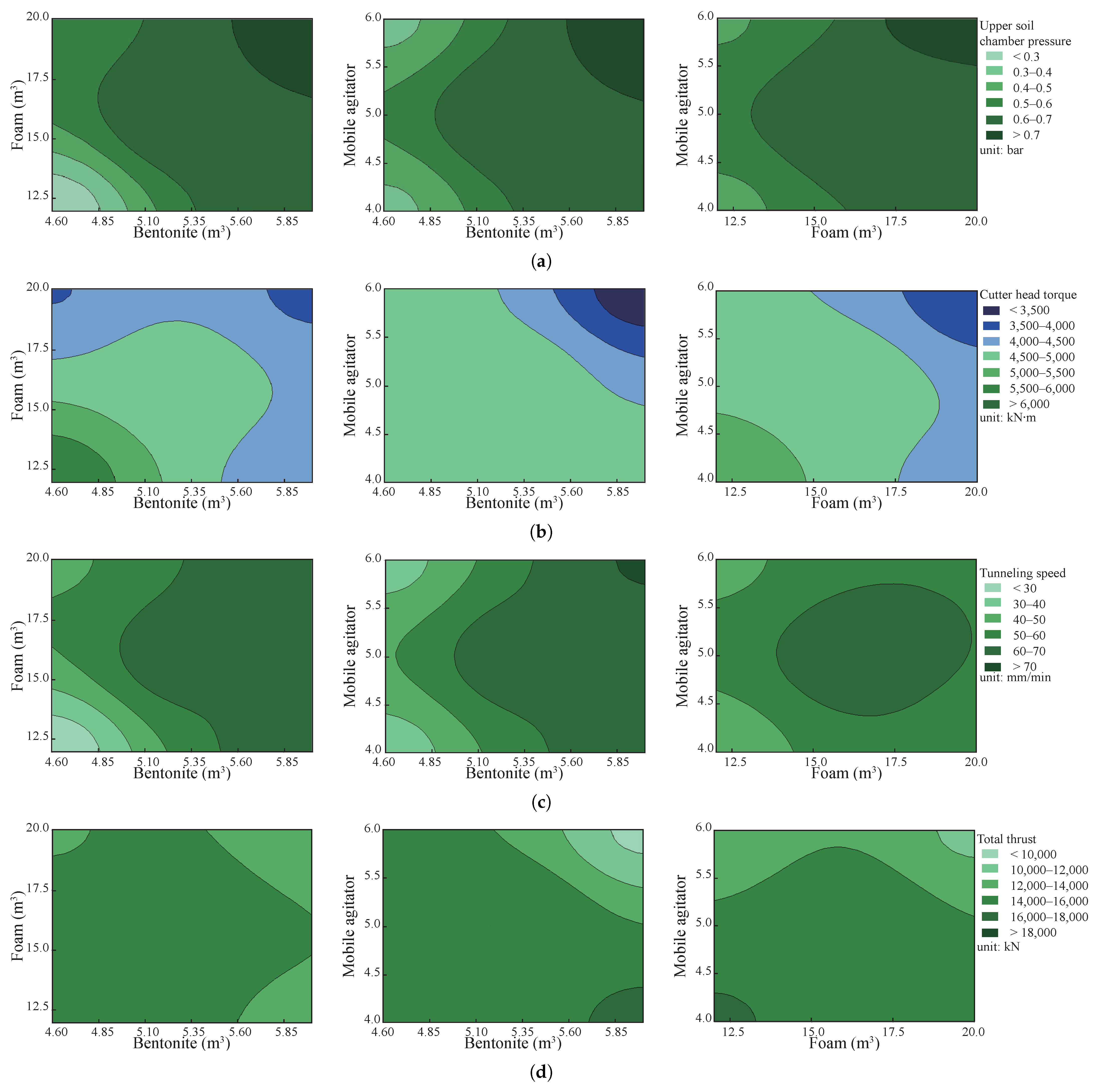- The correlations between the three considered soil conditioning factors (bentonite slurry injection, foam injection, and number of mobile agitators) and the four tunneling parameters (upper soil chamber pressure, cutterhead torque, tunneling speed, and total thrust) were analyzed using an FFD to derive their quantitative relationships. These relationships, presented in the form of contours, provide a reference for determining the dosages of soil conditioning agents during EPBS tunneling in similar strata.