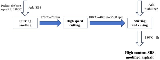 Due to the high content of SBS, in order to ensure sufficient reflection between SBS and matrix asphalt, a high-speed shearing machine and mixer were used to prepare SBS-modified asphalt. The specific preparation process is shown in Figure 1.