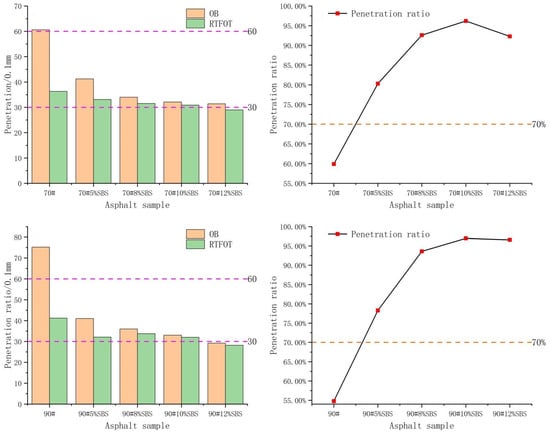 Penetration (left) and penetration ratio (right). (top) 70#binder; (bottom) 90# binder.