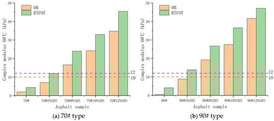The 60 °C complex shear modulus (G*) of modified asphalts with different SBS contents (0%, 5%, 8%, 10%, 12%) was measured in both the original state (OB) and after RTFOT aging to explore the influence mechanisms of SBS content, aging process, and base asphalt type on the high-temperature deformation resistance of asphalt. The result is shown in Figure 4.