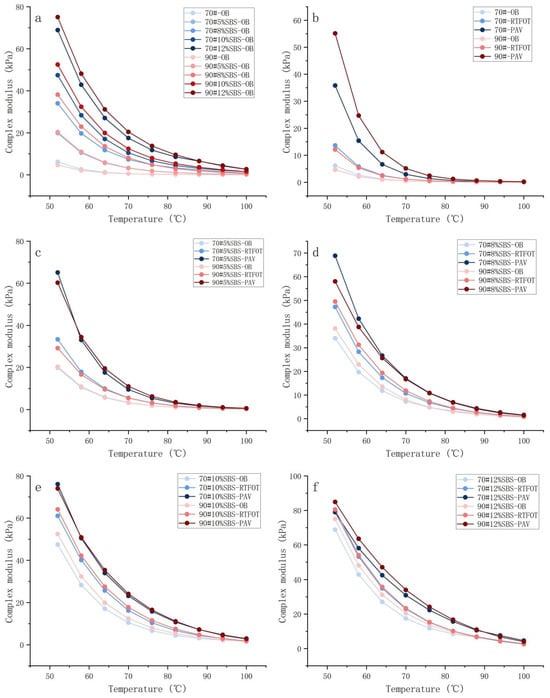 Complex modulus. (a) SBS-modified asphalt with different SBS contents (original state); (b) base asphalt under different aging states; (c) 5% SBS-modified asphalt under different aging states; (d) 8% SBS-modified asphalt under different aging states; (e) 10% SBS-modified asphalt under different aging states; (f) 12% SBS-modified asphalt under different aging states.