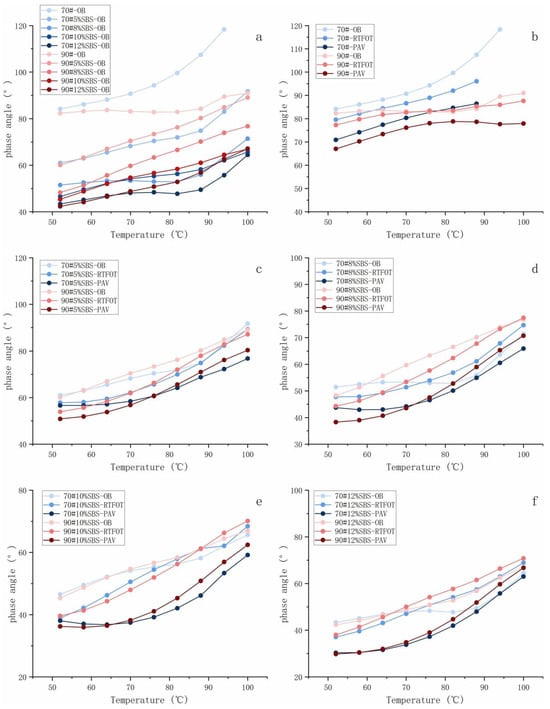 Phase angle. (a) SBS-modified asphalt with different SBS contents (original state); (b) Base asphalt under different aging states; (c) 5% SBS-modified asphalt under different aging states; (d) 8% SBS-modified asphalt under different aging states; (e) 10% SBS-modified asphalt under different aging states; (f) 12% SBS-modified asphalt under different aging states.