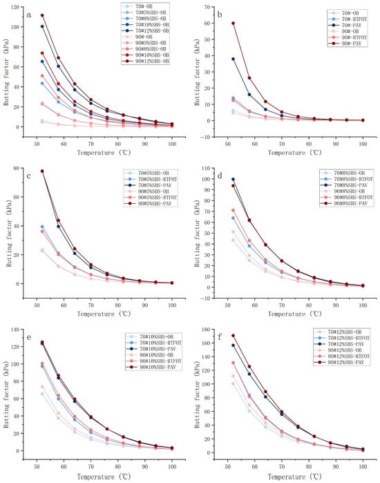 Rutting test and PG classification. (a) Modified asphalts with five different SBS contents: (b) 70# base asphalt; (c) 70# asphalt modified with 5% SBS; (d) 70# asphalt modified with 8% SBS; (e) 70# asphalt modified with 10% SBS; (f) 70# asphalt modified with 12% SBS.