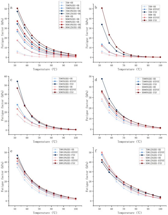 Fatigue factor. (a) 70# modified asphalts with five different SBS contents; (b) 70# base asphalt; (c) 70# asphalt modified with 5% SBS; (d) 70# asphalt modified with 8% SBS; (e) 70# asphalt modified with 10% SBS; (f) 70# asphalt modified with 12% SBS.