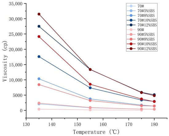 The rotational viscosity test (using a Brookfield viscometer) measures the flow resistance (unit: Pa·s) of asphalt at 135 °C, 155 °C, 175 °C, and 180 °C, which is used to evaluate its workability and pumpability during construction [22]. Due to the polymer swelling effect, the viscosity of SBS-modified asphalt is significantly higher than that of base asphalt. Excessively high viscosity may cause segregation during paving; thus, this indicator provides direct guidance for determining mixing and compaction process parameters, as well as the application of warm-mix modification technology.