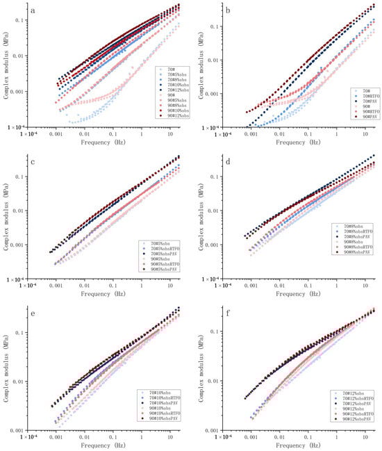 Main curve of the complex modulus of asphalt. (a) base binder; (b) aging binder; (c) asphalt modified with 5% SBS; (d) asphalt modified with 8% SBS; (e) asphalt modified with 10% SBS; (f) asphalt modified with 12% SBS.