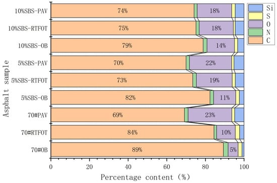 XPS quantified surface elemental composition (C, O, S) of 70# base asphalt and its 5%/10% SBS-modified counterparts under original, RTFOT, and PAV aging states (Figure 12). Carbon content (core organic component) decreased with aging: 70# base asphalt’s C content dropped from 89.31% (original) to 69.15% (PAV), while 10% SBS-modified asphalt’s C content only dropped to 74.13% (PAV)—indicating the SBS network inhibits light component loss. Oxygen content (oxidation degree indicator) increased with aging: 70# base asphalt’s O content rose from 5.2% (original) to 22.67% (PAV), while 10% SBS-modified asphalt’s O content only reached 17.86% (PAV)—the SBS network blocks oxygen penetration and reduces oxidative product formation. Sulfur content (sulfide stability indicator) decreased in low-content SBS systems (5% SBS: 1.88% original → 1.19% PAV) but slightly increased in high-content systems (10% SBS: 1.61% original → 1.84% PAV)—the SBS network restricts sulfide migration and may induce cross-linking reactions. XPS confirms that high-content SBS enhances asphalt’s anti-aging ability from an elemental perspective.