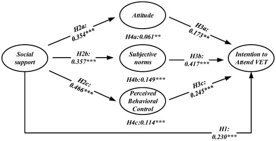 In addition, previous research has consistently found a positive correlation between SN and individuals’ behavioral intentions [43,44]. This is supported by organizational behavior theory, which emphasizes how the external environment shapes individual behavior, as people tend to align their behavior with social norms to gain social acceptance and approval [45]. For migrant construction workers, the opinions and support of their social networks can significantly influence their IAVET. If VET is perceived as valued and encouraged by these groups, workers are more likely to engage in it.