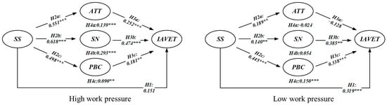 For SN, high WP elevates cognitive load and narrows workers’ attention to immediate work tasks [53], making them less responsive to peer expectations or organizational encouragement. It also increases turnover intention and psychological detachment [54], thereby reducing the extent to which SS can strengthen SN and, in turn, IAVET. High WP also undermines PBC by increasing mental stress and making it difficult to balance work and personal responsibilities [55]. Zhang et al. [18] reported that Chinese migrant construction workers often face frequent night shifts, inflexible schedules, and unpredictable job demands, leaving them too overwhelmed to pursue VET. Therefore, the positive effect of SS on PBC and IAVET may weaken under high WP. Conversely, in low WP situations, individuals are more likely to act in accordance with their beliefs and values, strengthening the positive impact of PBC on intentions [56]. Thus, the following hypotheses are proposed: