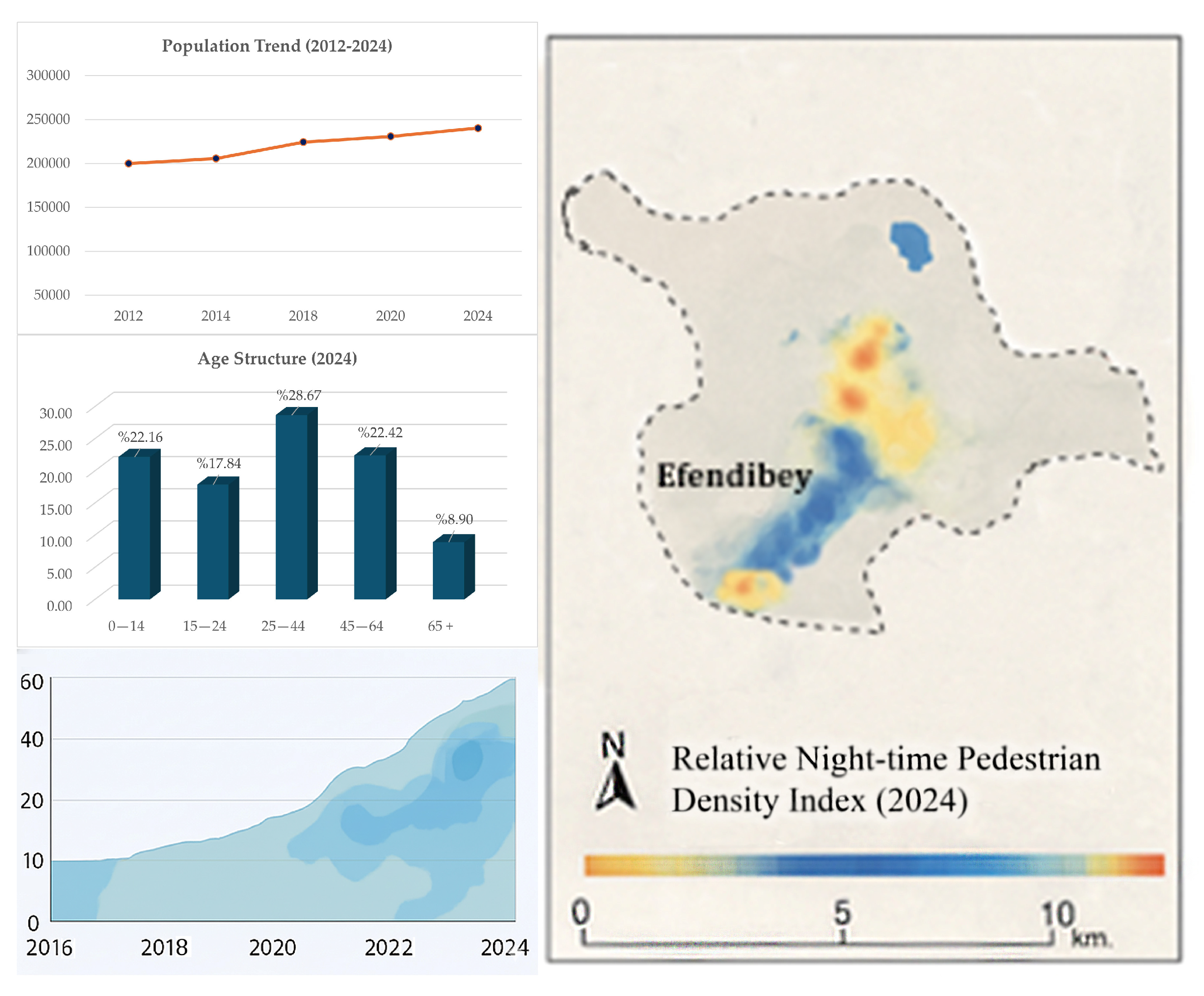 This demographic expansion is accompanied by a structural predominance of the working-age group (25–44 years, 28.67%) and a relatively large share of children and youth (0–24 years, 40%), both of which contribute significantly to the spatial and temporal dynamics of nighttime activity.