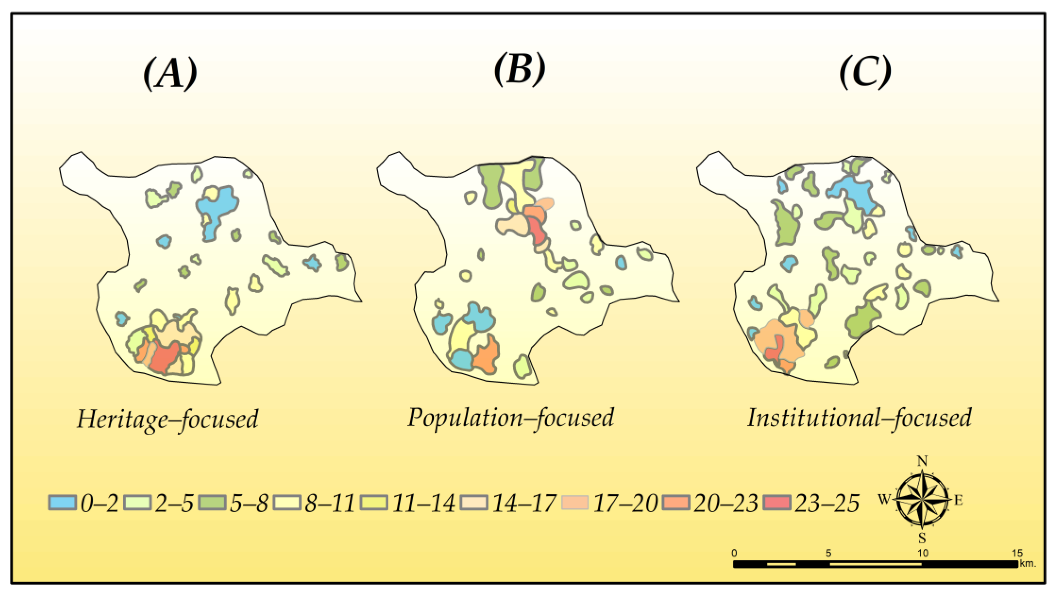 To evaluate the robustness of the proposed GIS-based lighting model and explore the implications of alternative planning priorities, a scenario-based sensitivity analysis was conducted. Three weighting configurations were designed to emphasize different urban values: heritage conservation (Scenario A), population dynamics (Scenario B), and institutional importance (Scenario C). These alternative scenarios were applied to the same set of reclassified raster layers, maintaining consistent spatial resolution and normalization parameters. The resulting lighting priority maps are presented in