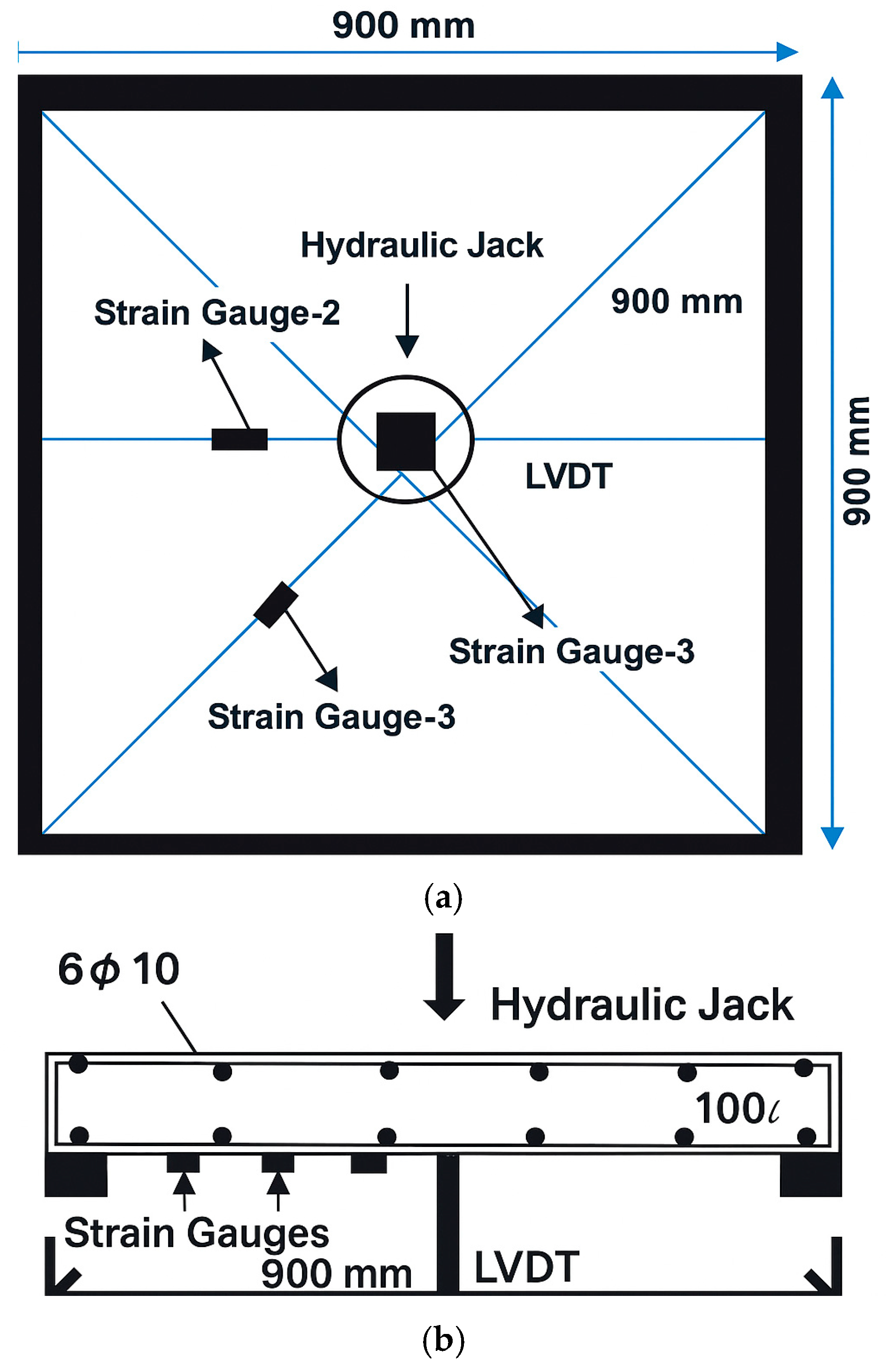 Deflection behavior in the two-way slabs was evaluated during load application using a Linear Variable Differential Transformer (LVDT) positioned at the bottom center of each slab. Deflection readings were recorded immediately after the first crack appeared for each slab type, as illustrated in