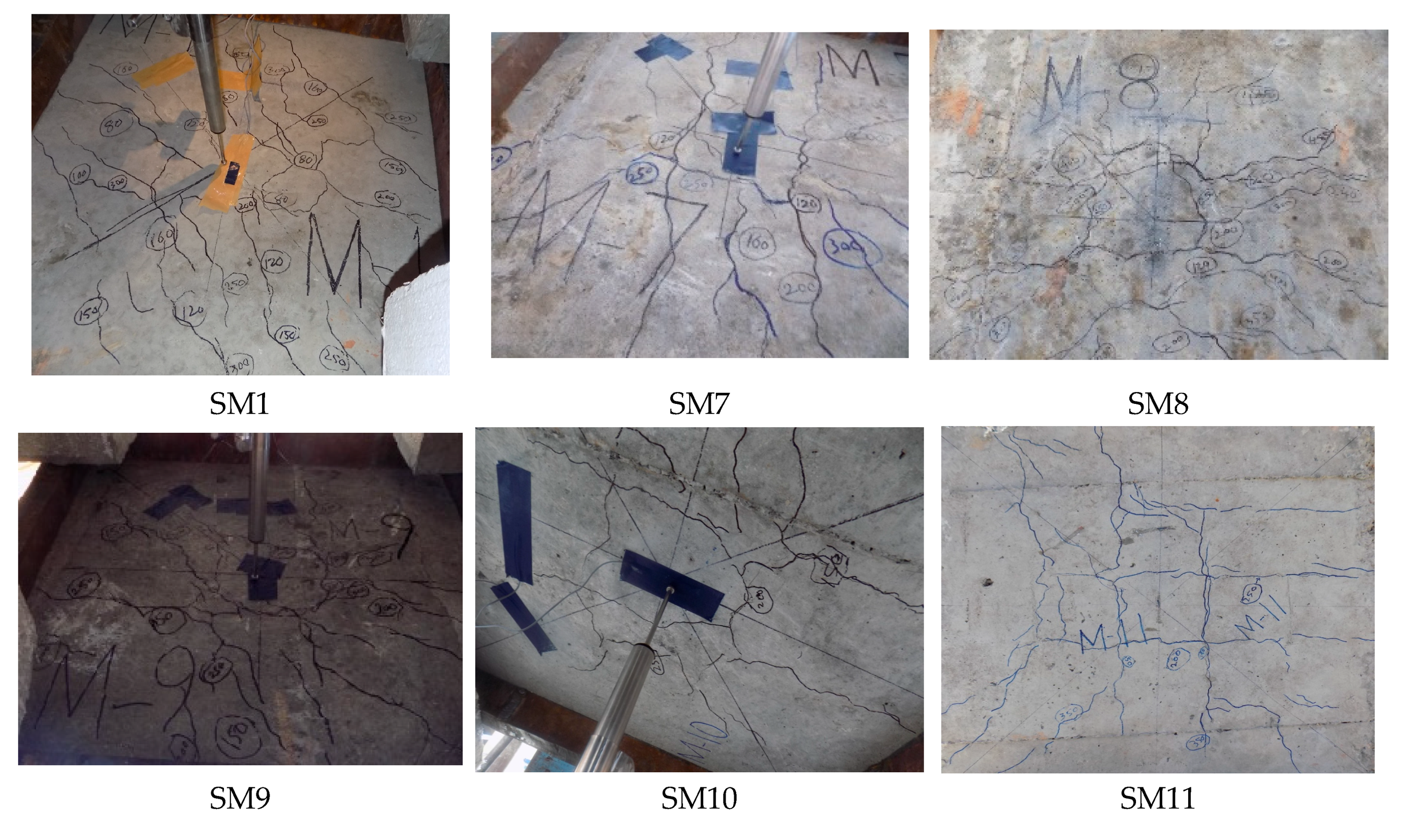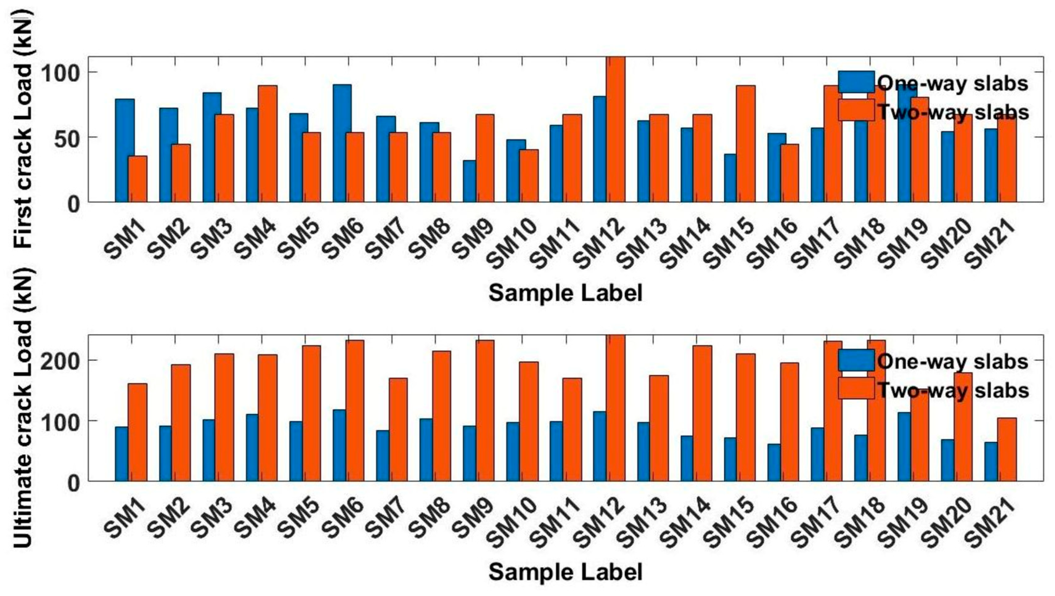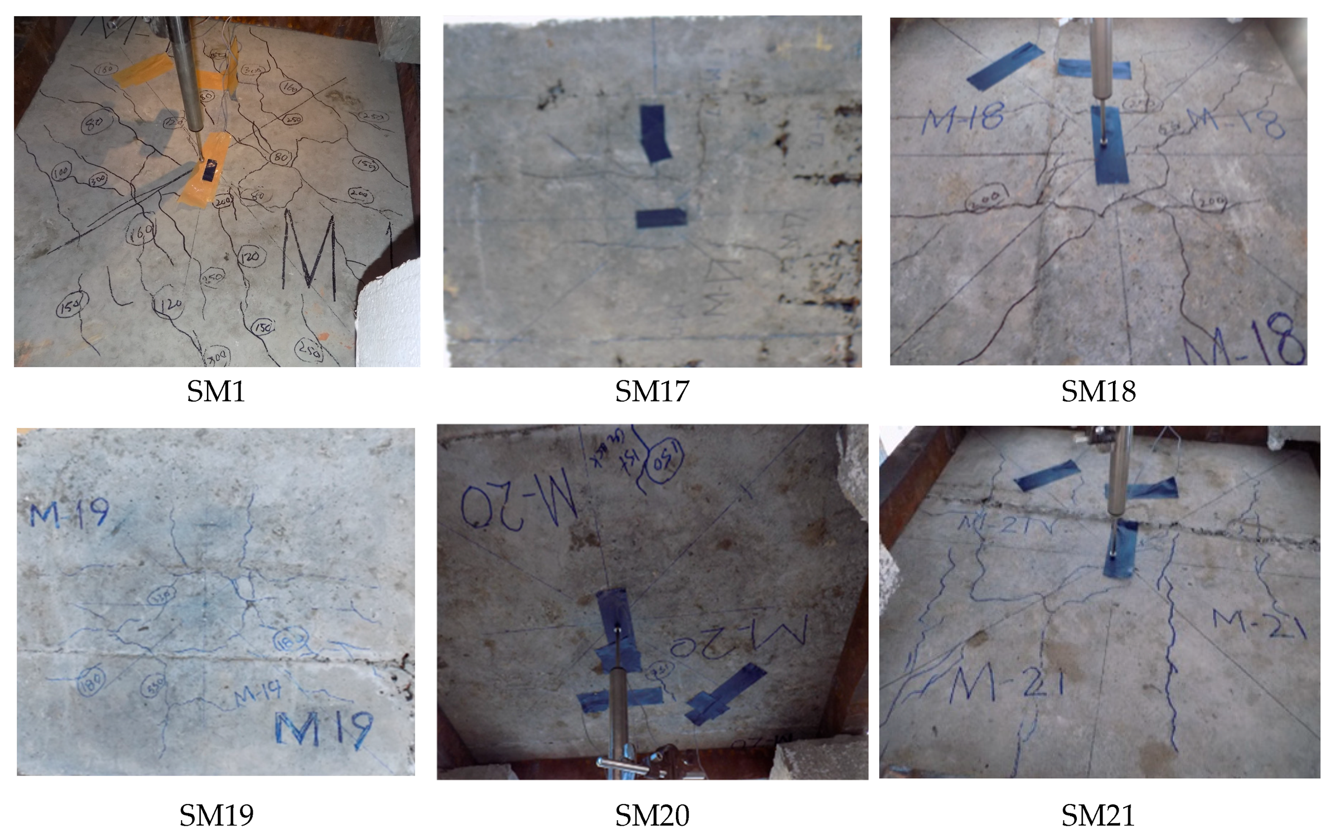 In two-way slabs, failure primarily manifested as flexural cracking, with cracks originating at the slab edges and propagating toward them. This mode of failure indicates that the slabs experienced significant bending stresses, leading to crack formation in the tensile zone. As the applied load exceeded the material’s capacity to withstand bending, the cracks expanded, ultimately reaching the edges—a typical failure pattern for slabs subjected to flexural loading. This behavior highlights the critical role of reinforcement and the fibers’ capacity to reduce crack formation and enhance load-bearing capability. An increase in load-carrying capacity was observed, ranging from 5.76% to 55.0%, except for slabs SM19 and SM21. These specimens demonstrated decreases in ultimate strength of 5.56% and 34.74%, respectively, attributed to fiber flocculation, balling action, improper mixing, and concrete bleeding. The trends observed align with the recorded loads at the initiation of cracking, as presented in