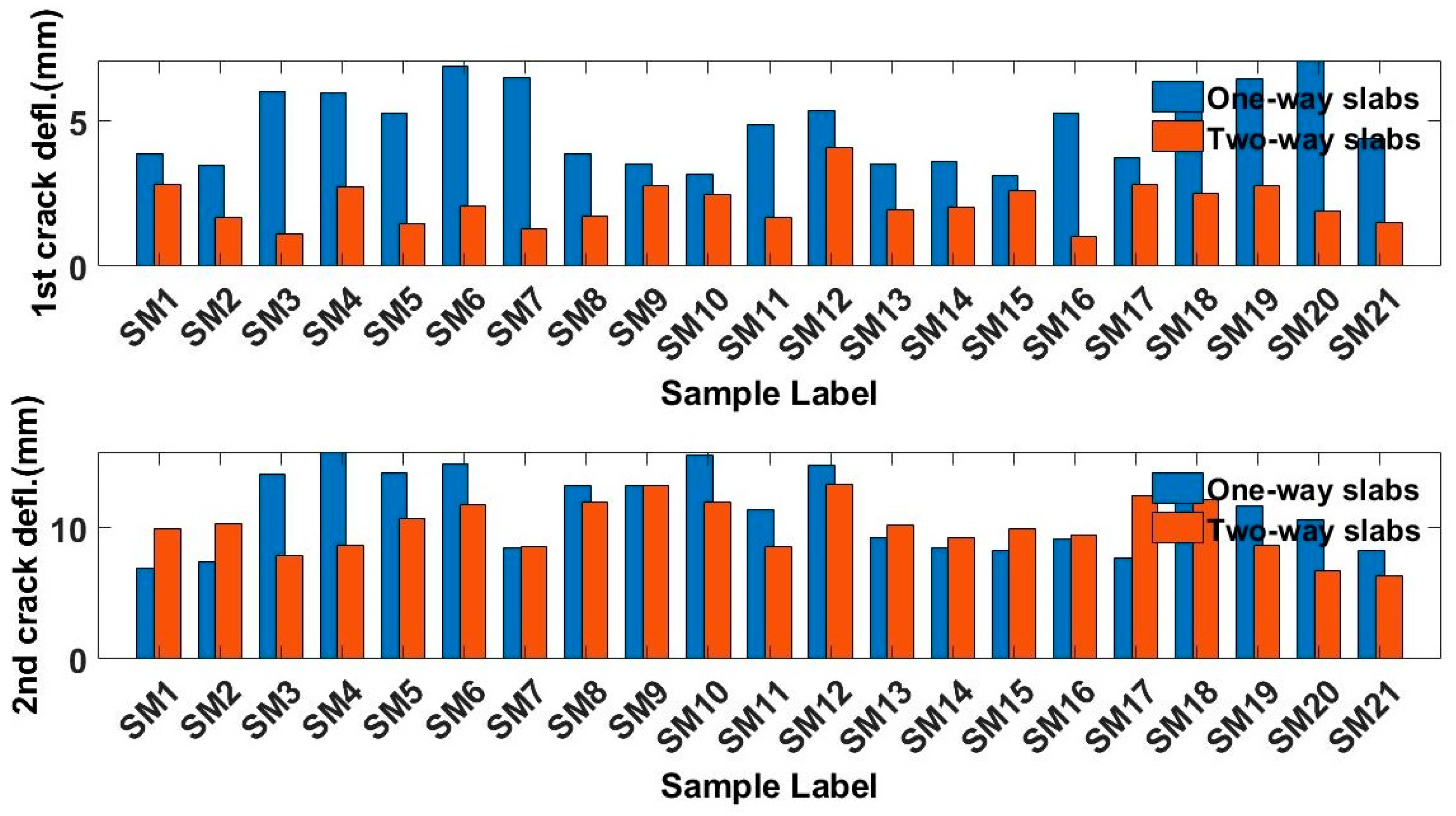 For one-way slabs, the observed behavior did not exhibit a consistent trend. Specifically, in the case of specimen SM21, which contained the highest concentration of steel and polypropylene fibers, initial cracking occurred at a relatively low load of 56.65 kN, significantly lower than the load sustained by the control specimen. Conversely, specimen SM3, with only 0.7% steel and 0.3% polypropylene fibers, demonstrated improved performance, withstanding a load of 84.13 kN before cracking. The highest load at the onset of cracking was recorded for specimen SM6, which reached 90.25 kN. The complete set of experimental results is detailed in