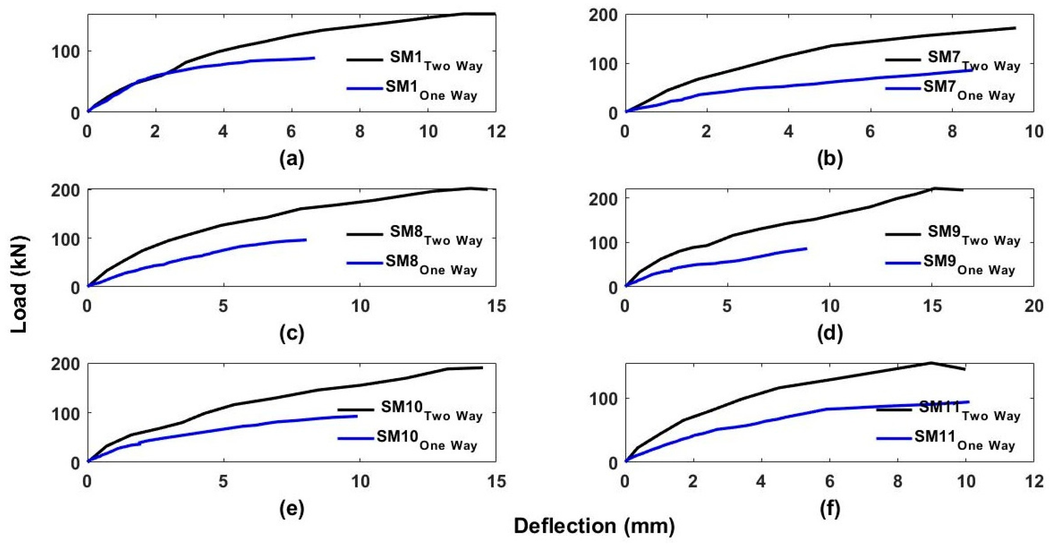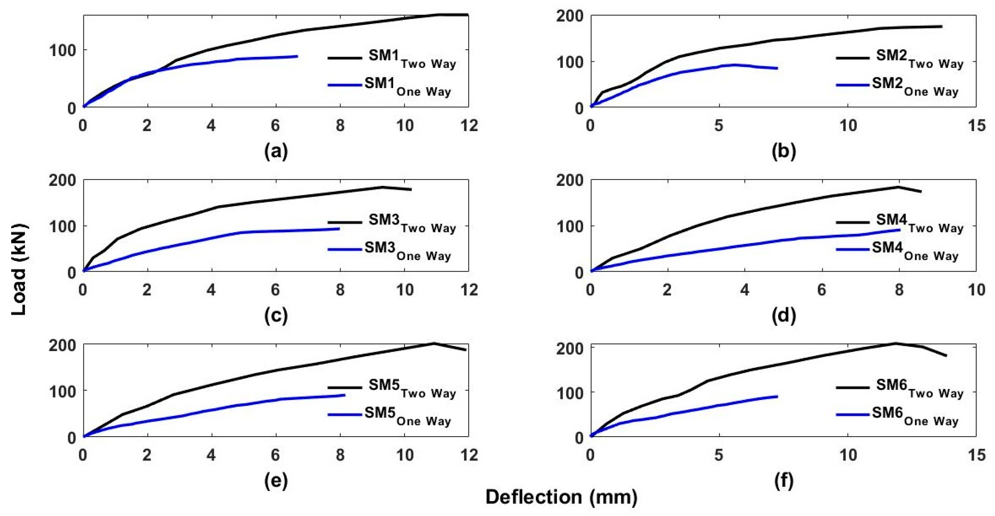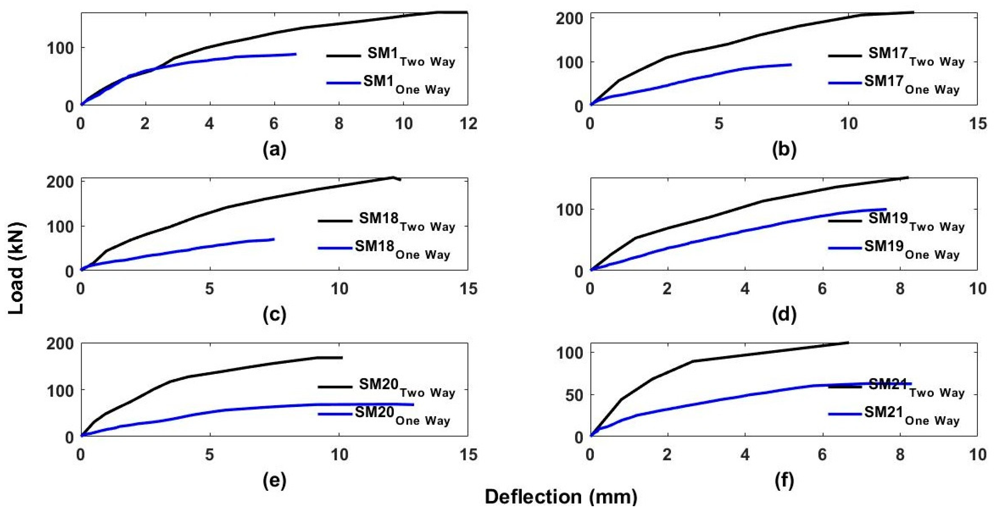 Figure 16 compares the load-deflection responses of six structural elements labeled SM1, SM17, SM18, SM19, SM20, and SM21 under two-way and one-way loading conditions. The vertical axis represents the applied load in kilonewtons (kN), while the horizontal axis shows deflection in millimeters (mm). The black curves represent two-way loading in all six cases, and the blue curves correspond to one-way loading. Across all specimens, the two-way loading condition consistently demonstrates superior performance, achieving higher load-carrying capacity and lower deflection than the one-way loading condition. For instance, in SM17 and SM18, the two-way responses reach approximately 200 kN, whereas the one-way curves level off at much lower loads. Similarly, for SM19, SM20, and SM21, the two-way loaded elements display steeper slopes and sustain higher loads before significant deflection, whereas the one-way curves exhibit earlier saturation and greater deformation. These results highlight the structural advantage of two-way loading, as it efficiently distributes loads, leading to improved stiffness and a higher strength capacity compared to one-way loading.