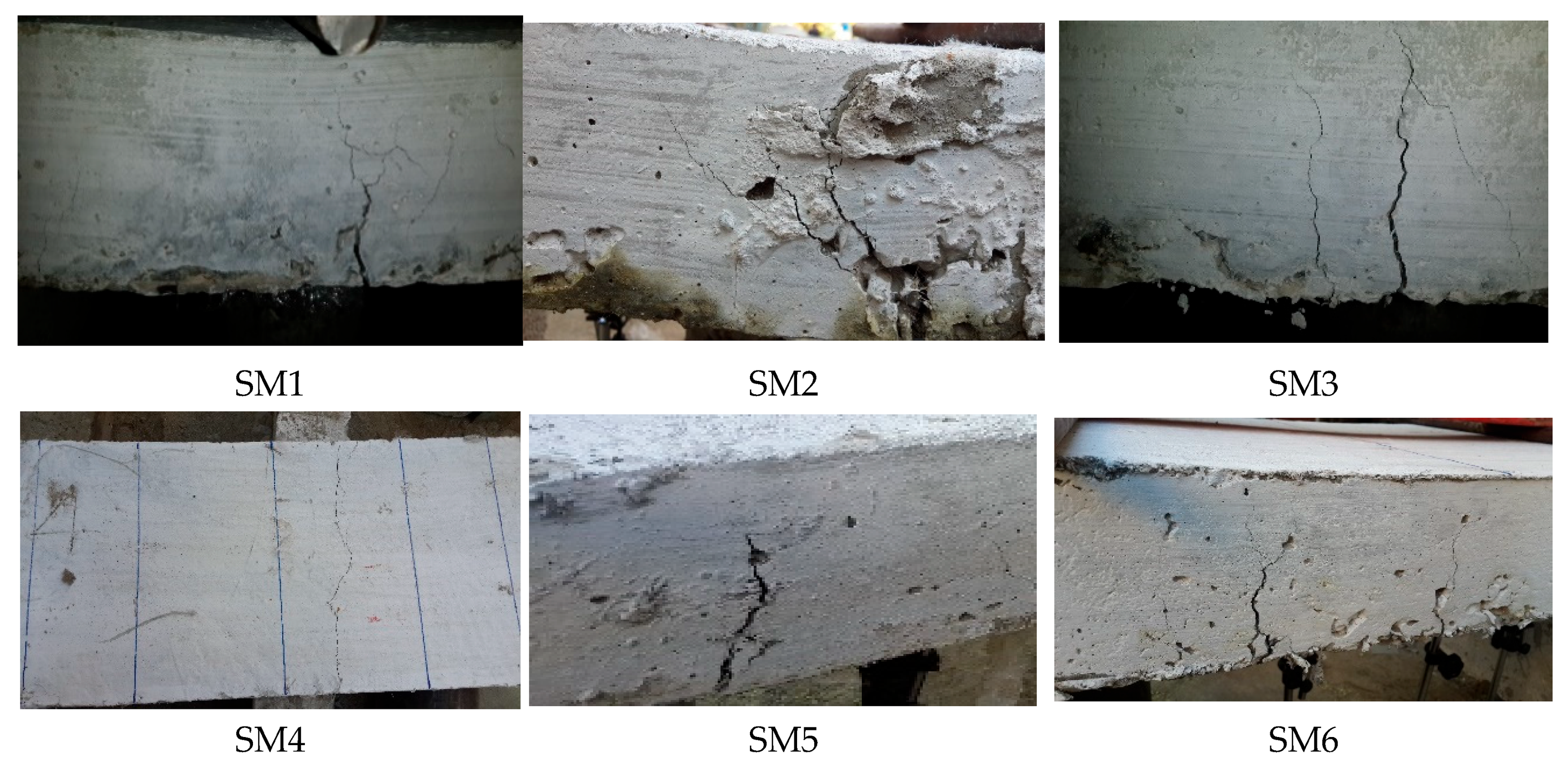 This performance can be attributed to a complementary fiber-level mechanism. The polypropylene fibers, being numerous and finely distributed, are highly effective at controlling micro-crack initiation and growth within the cementitious matrix. This micro-crack control allows the concrete to sustain higher stresses before localized damage coalesces into a critical macro-crack. Once a macro-crack forms, the higher modulus steel fibers engage, providing robust bridging across the crack faces. Their primary role is to resist crack opening through pull-out resistance, which requires substantial energy and translates into the high post-cracking load capacity and large deflection observed in SM6. Therefore, the optimal combination of 0.7% SF and 0.9% PF creates a multi-scale defense: polypropylene fibers enhance the pre-cracking integrity and delay the onset of major cracking, while steel fibers provide the post-cracking ductility and strength, resulting in superior overall toughness. The crack patterns in