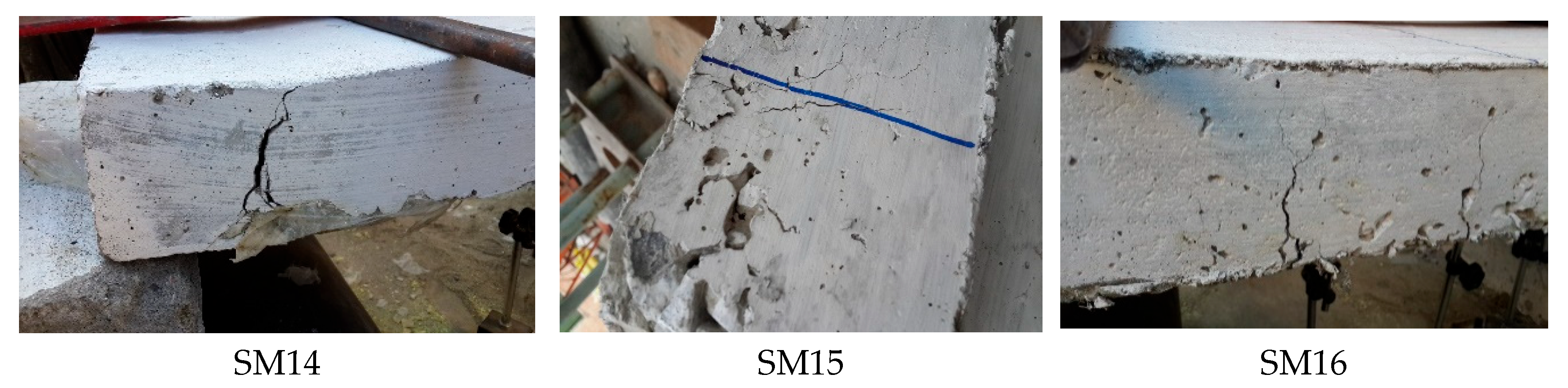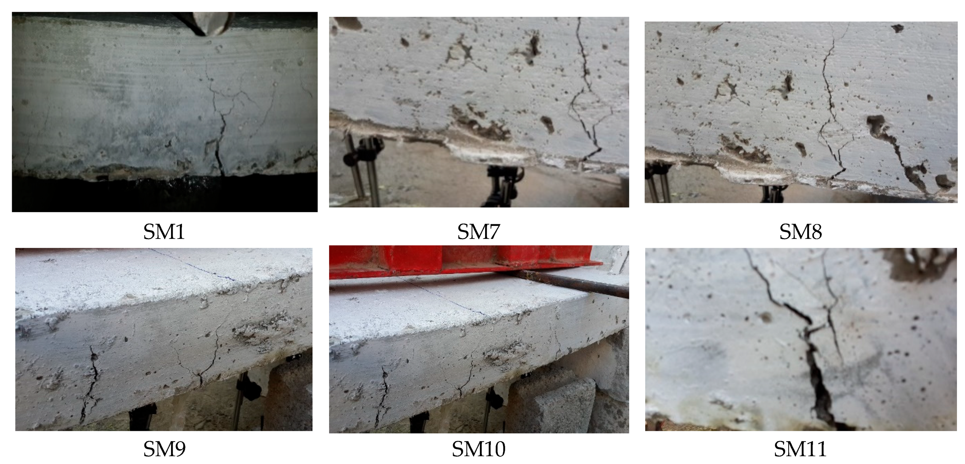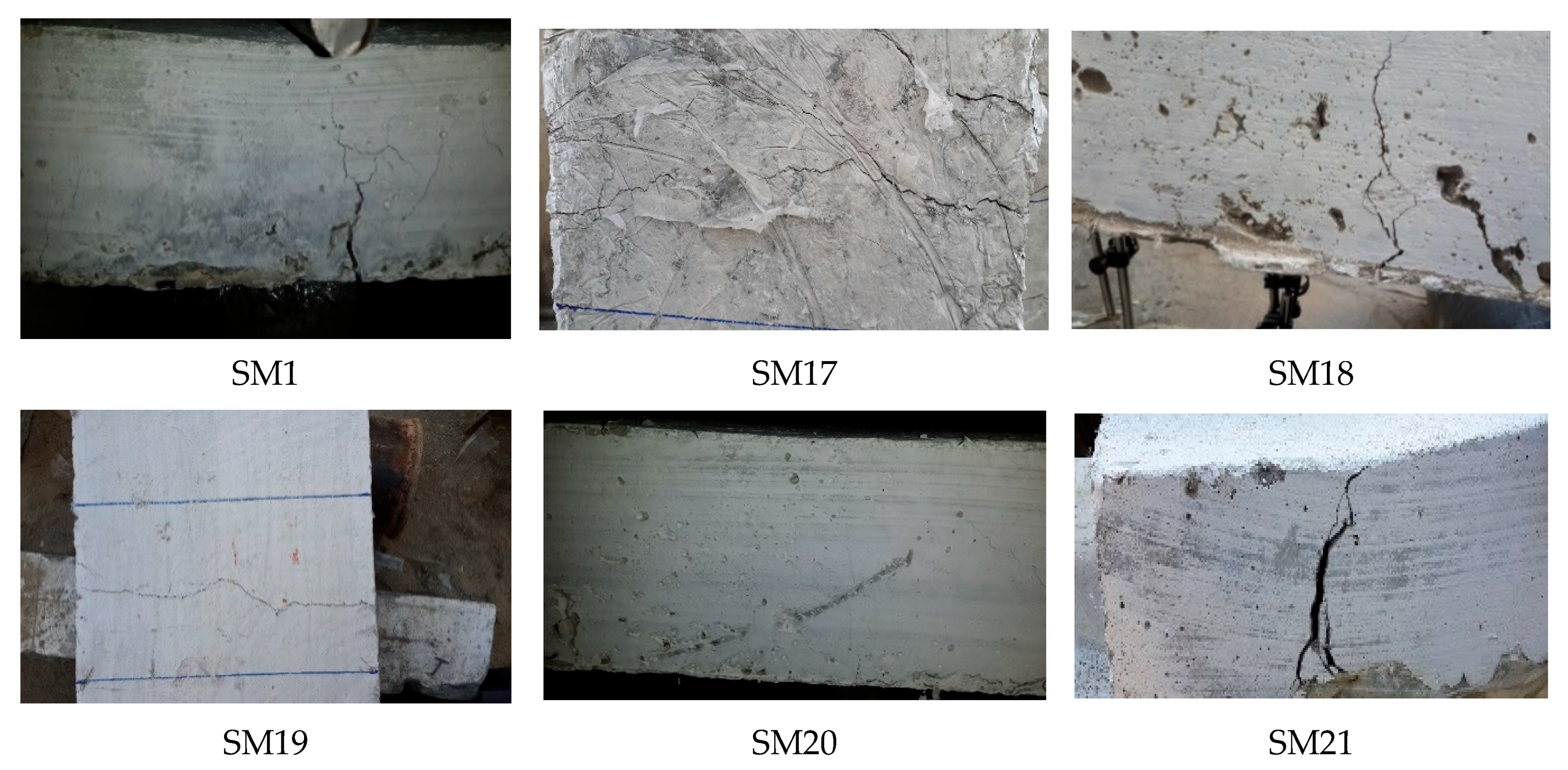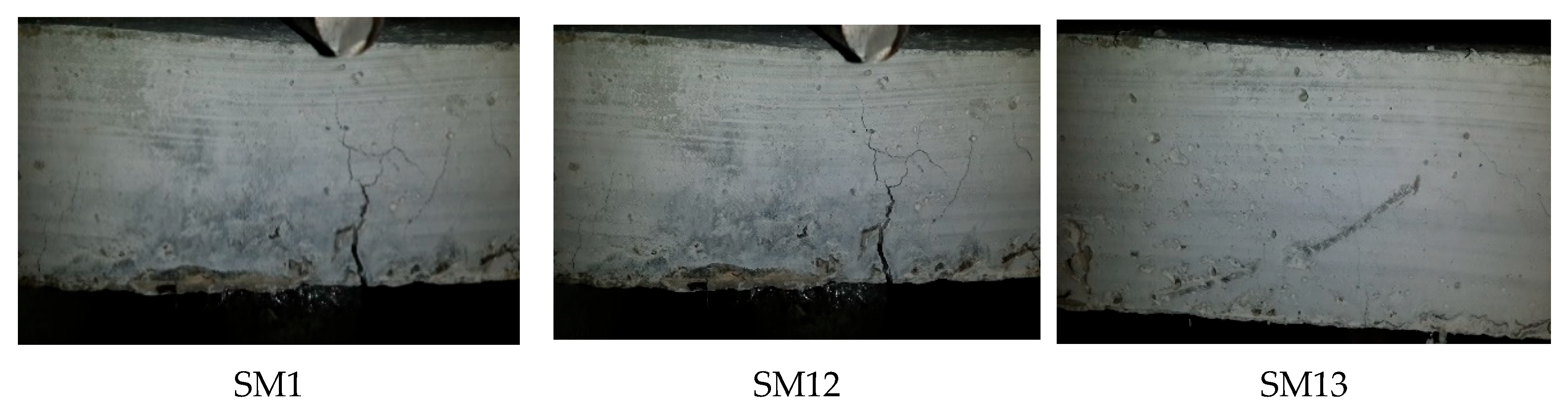 It was observed that cracking was initiated at the loading point (center) in all specimens. In specimen SM12, which exhibited the highest load-carrying capacity and corresponding deflection, the cracks at the bottom formed a triangular shape, which proved most effective in enhancing both the load-carrying capacity and the vertical mid-span deflection. In contrast, specimen SM13 failed without significant concrete crushing and exhibited only minor cracks, indicating a strong bond between the concrete. This was attributed to the use of 0.9% steel fibers (SF) and 0.3% polypropylene fibers (PF), which improved the specimen’s performance, as illustrated in