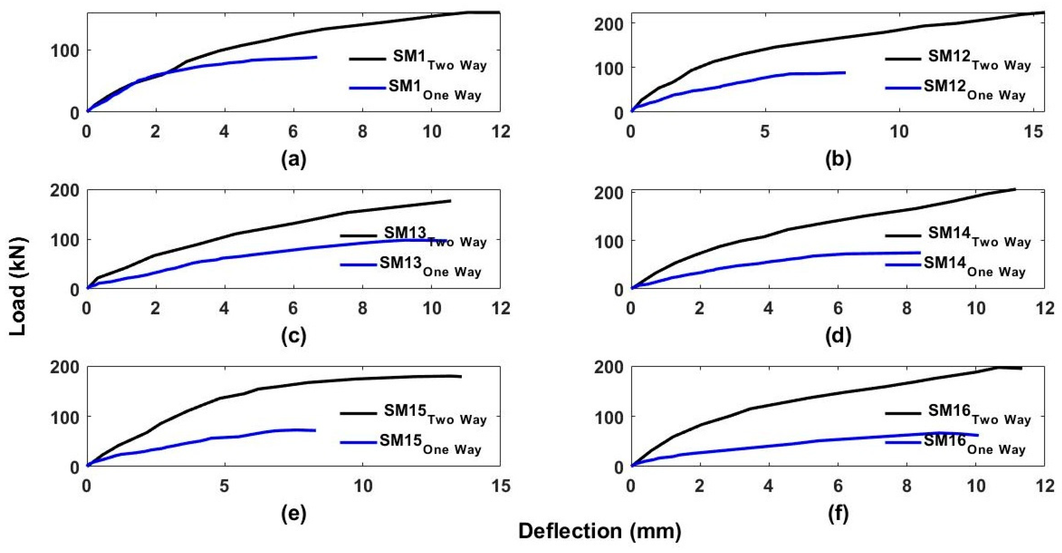 Figure 13 illustrates the load-deflection behavior for six additional structural elements labeled SM1, SM12, SM13, SM14, SM15, and SM16 under two-way and one-way loading conditions. The vertical axis represents the applied load in kilonewtons (kN), while the horizontal axis represents deflection in millimeters (mm). In all six graphs, the black curves correspond to two-way loading, while the blue curves represent one-way loading. The results demonstrate that two-way loading outperforms one-way loading across all specimens. The two-way loaded elements exhibit higher load-carrying capacity and stiffer responses, as evidenced by a higher peak load and reduced deflection at similar load levels. For instance, SM12 and SM14 exhibit loads approaching 200 kN under two-way loading, whereas their one-way counterparts plateau at significantly lower values. Similarly, for SM15 and SM16, two-way loading results in more gradual deflection with increasing load, whereas one-way loading is characterized by lower stiffness and earlier saturation of load capacity. These trends emphasize the efficiency of two-way load distribution in enhancing the tested elements’ structural performance by increasing their strength and reducing deformation.