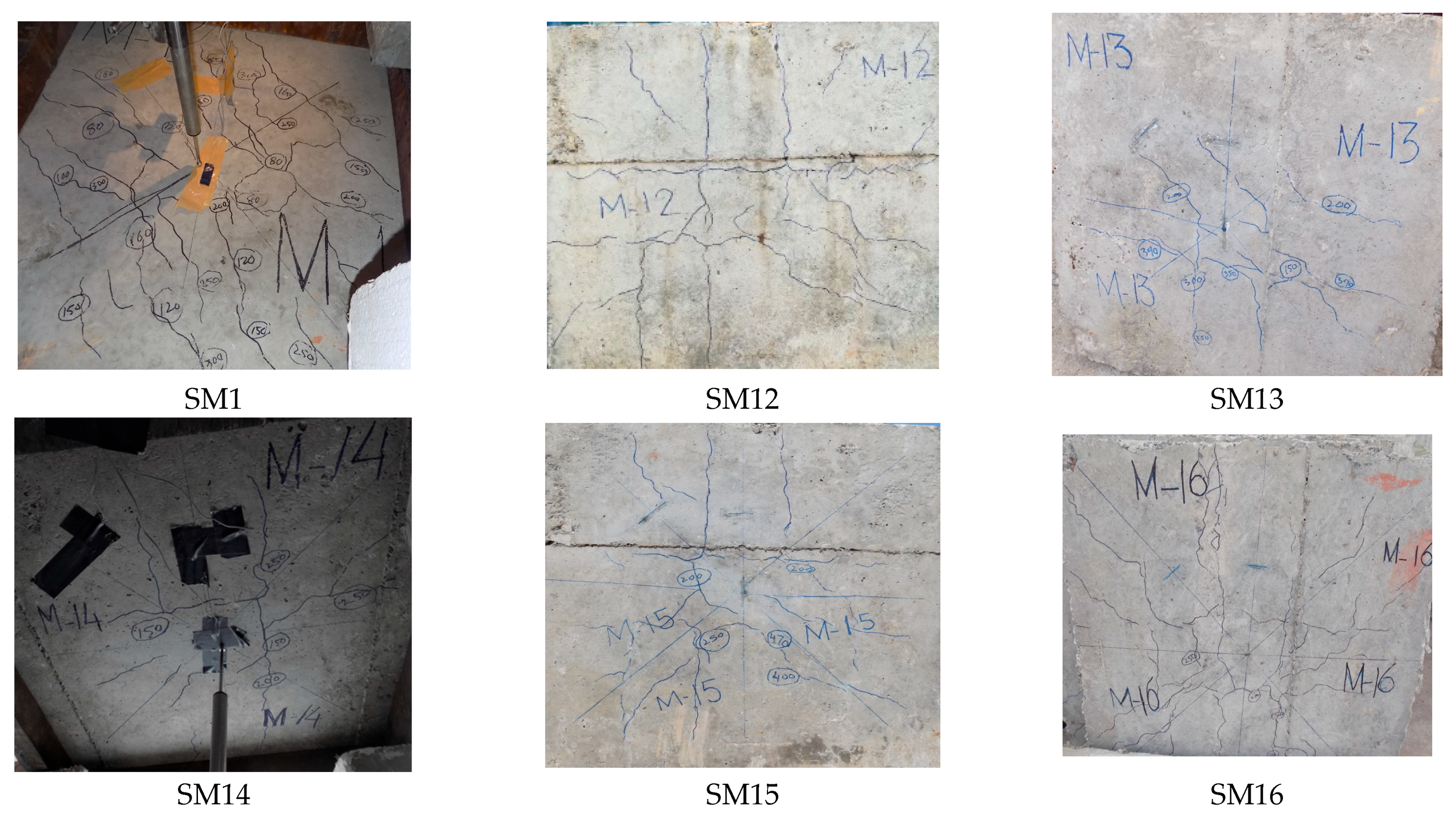 Figure 15, provide visual evidence of this mechanism. Specimen SM12, the top performer, developed a well-defined triangular crack pattern at the slab bottom. This pattern is indicative of efficient yield-line formation and excellent in-plane stress redistribution, facilitated by the fibers’ ability to maintain composite action after cracking. The fibers, particularly the high content of steel fibers, ensured that cracks remained tightly controlled, allowing the slab to develop its full plastic capacity. In contrast, specimen SM13 (0.9% SF, 0.3% PF) failed with only minor cracking and minimal concrete crushing. This behavior suggests an extremely strong fiber-matrix bond and a high degree of crack suppression, but it may also indicate a slightly more brittle failure mode where the energy absorption through fiber pull-out was less pronounced than in SM12.