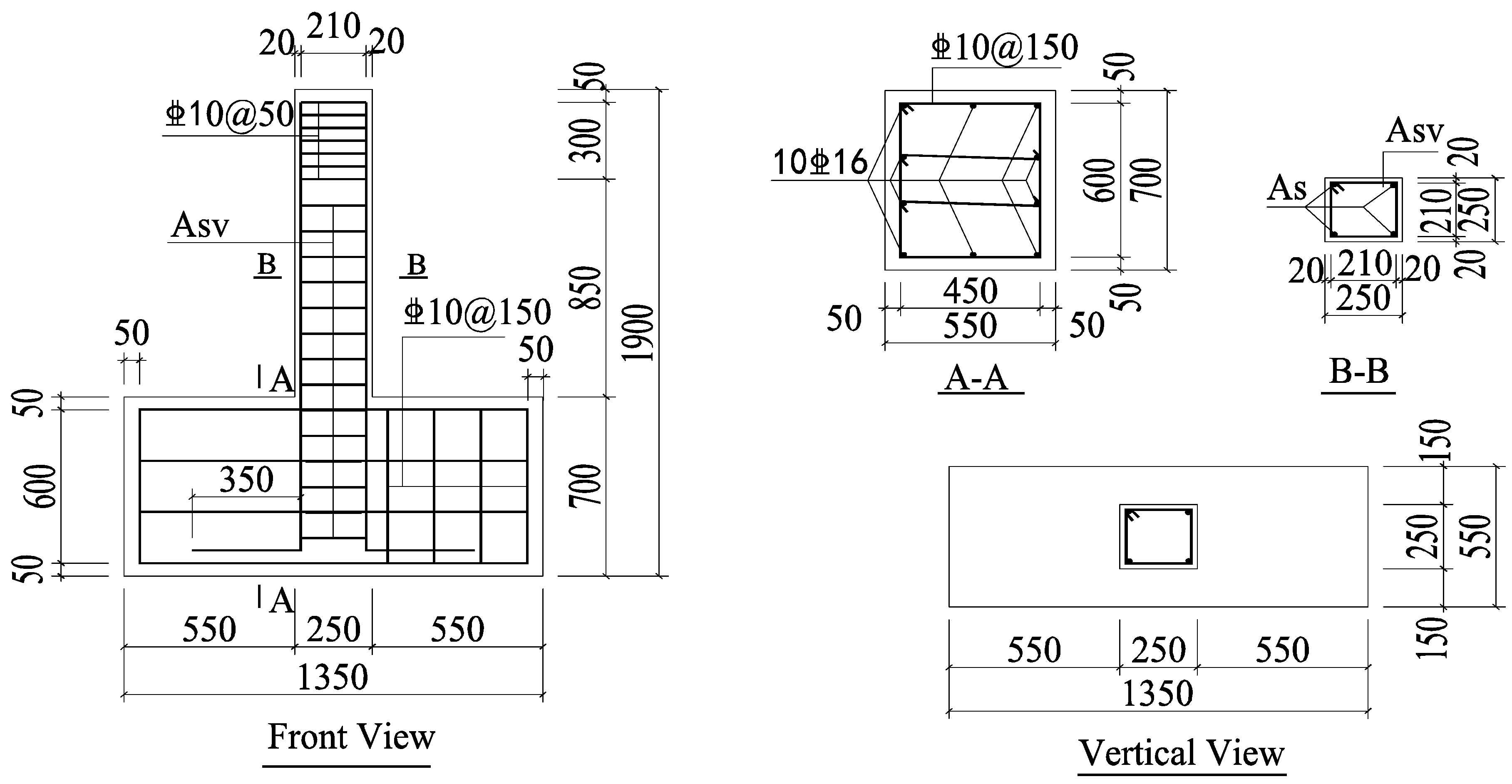Table 1, which details the two concrete grades employed—C45 and C60—along with their respective stirrup configurations. Under standard curing conditions, the measured cube compressive strengths reached 52.9 MPa for C45 and 66.9 MPa for C60. The experimental program incorporated two grades of reinforcement: conventional HRB400 and 630 MPa high-strength steel. The base of each specimen was constructed as a rectangular prism with dimensions of 1350 mm × 550 mm × 700 mm and a concrete cover thickness of 50 mm, with all reinforcing bars consisting of HRB400 grade (designated as Class C) steel. The upper concrete columns featured a square cross-section of 250 mm × 250 mm, reinforced symmetrically with a cover thickness of 20 mm. It should be noted that the cover thickness typically refers to the shortest perpendicular distance from the outer surface of longitudinal reinforcement to the concrete face. The mechanical properties of the HRB400 steel bars were as follows: average elongation 25.8%, lower yield strength (