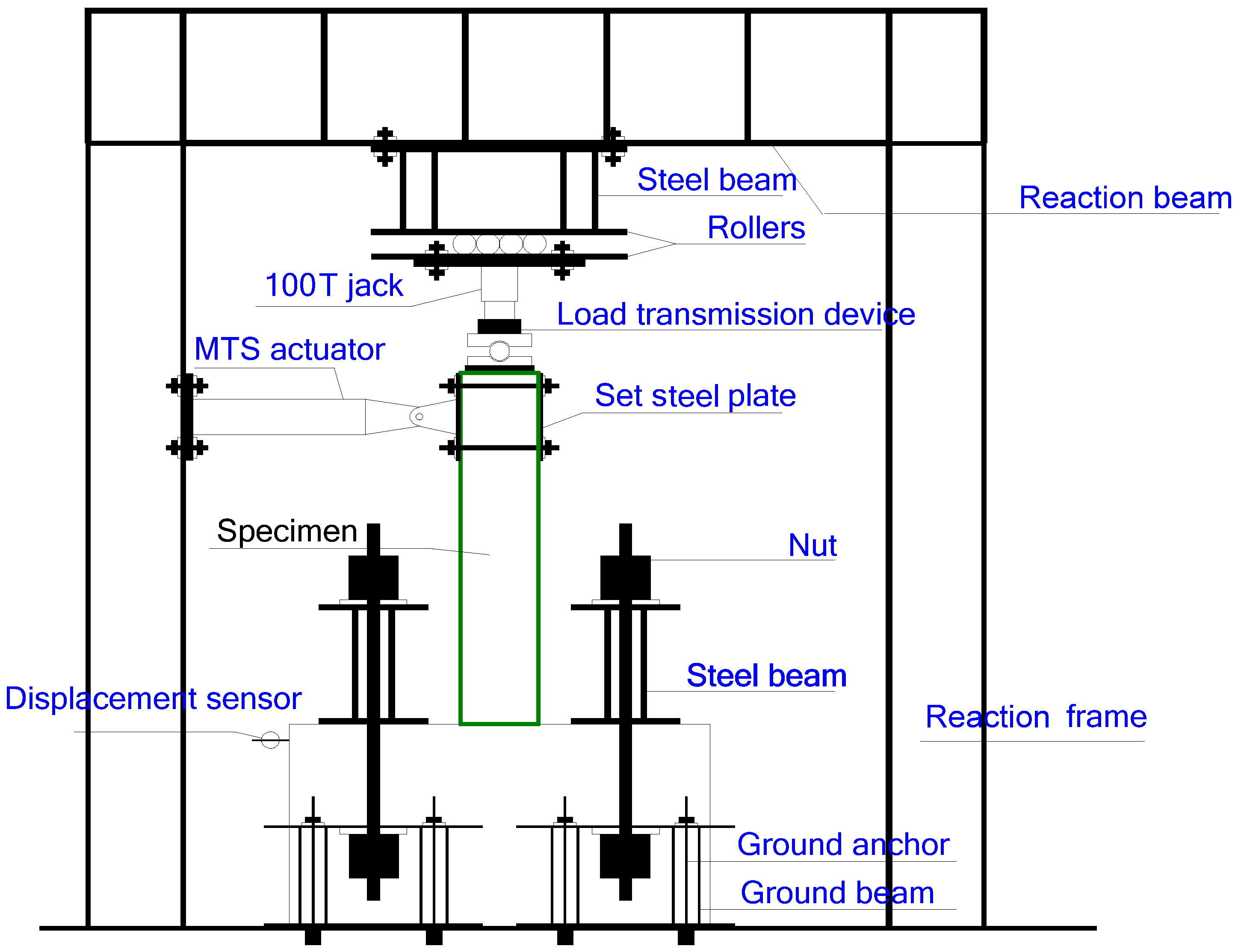 The quasi-static testing system comprised an MTS 1000 kN hydraulic actuator for applying lateral loads and a 1000 kN capacity hydraulic jack for maintaining constant axial compression on the column specimens. Structural response measurements were recorded using a DH3816 static strain acquisition system. The complete test setup configuration is presented in