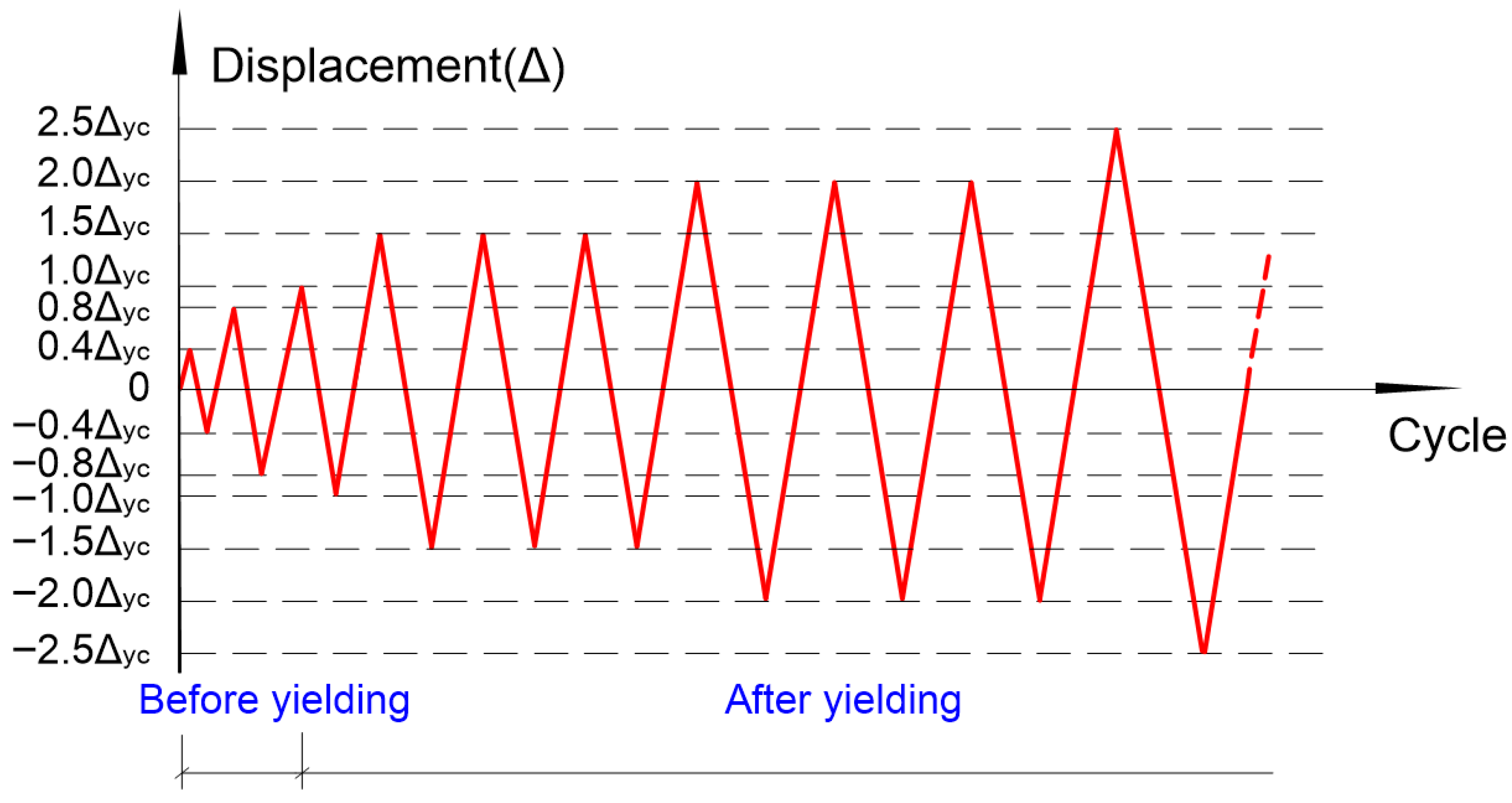 yc. The test was terminated when a 15% degradation in peak load capacity was observed during any loading cycle, indicating significant specimen strength deterioration. The loading protocol applied in experimental tests is illustrated in