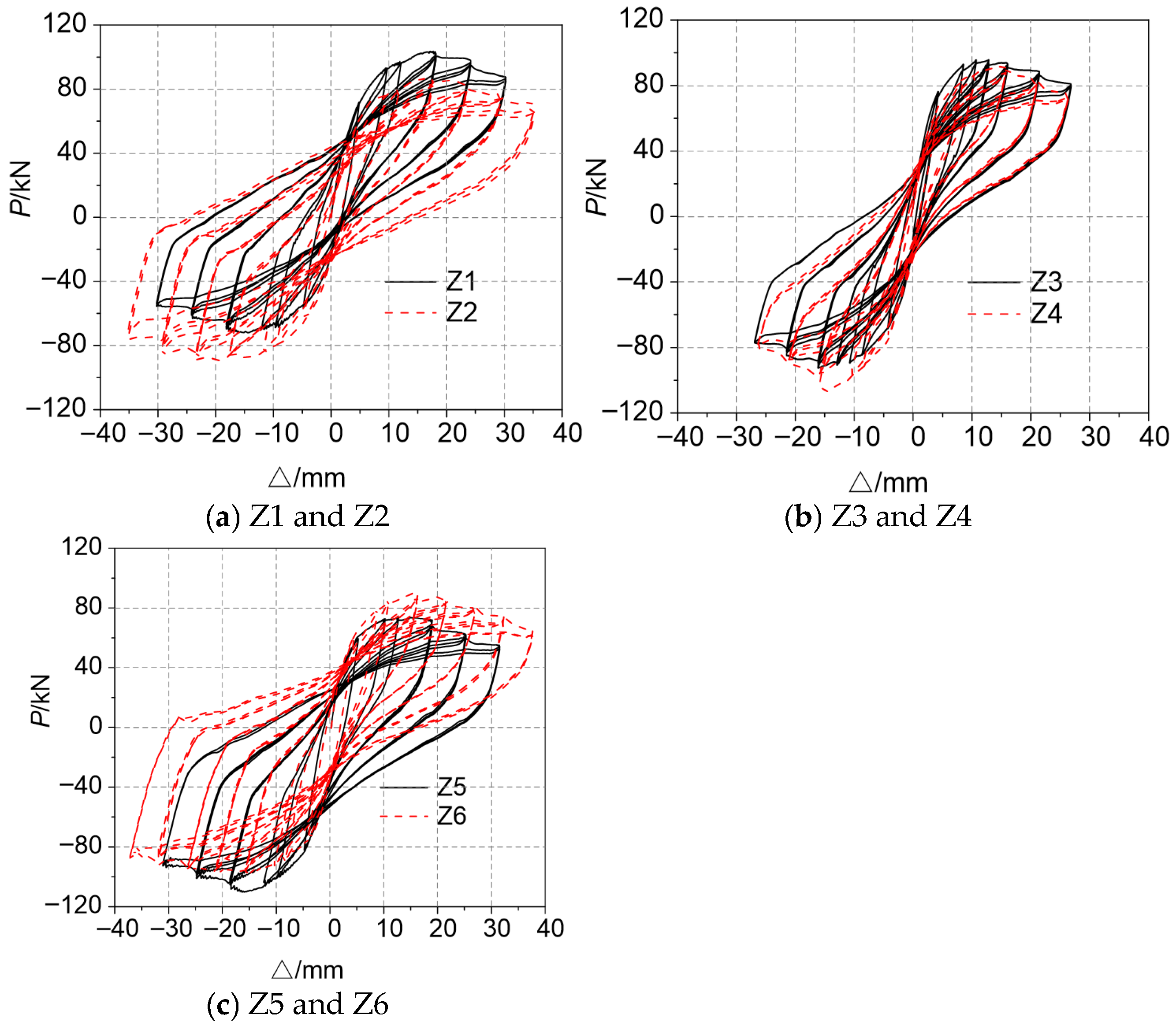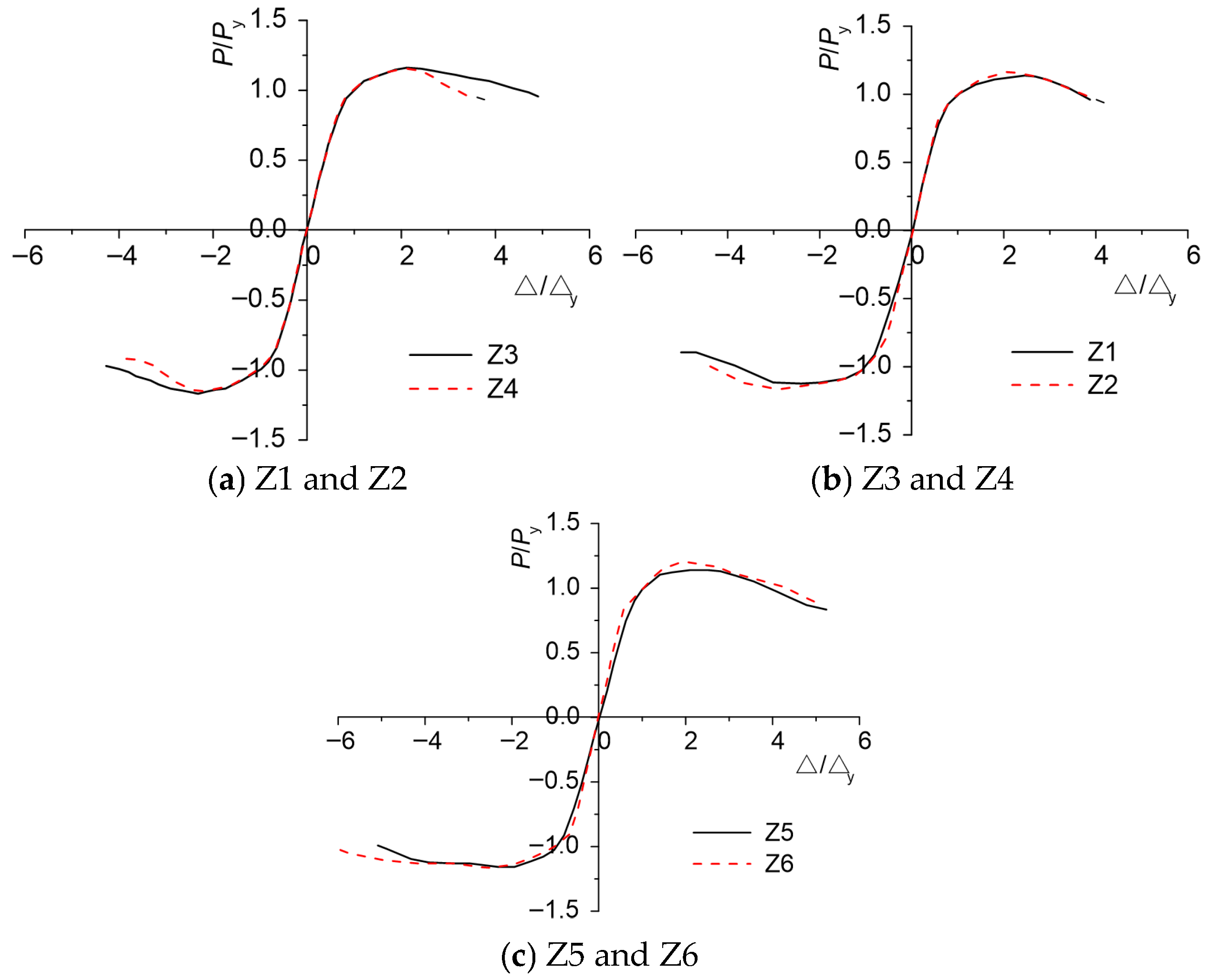 3.1. Hysteresis Behavior and Normalized Skeleton Curves Analysis