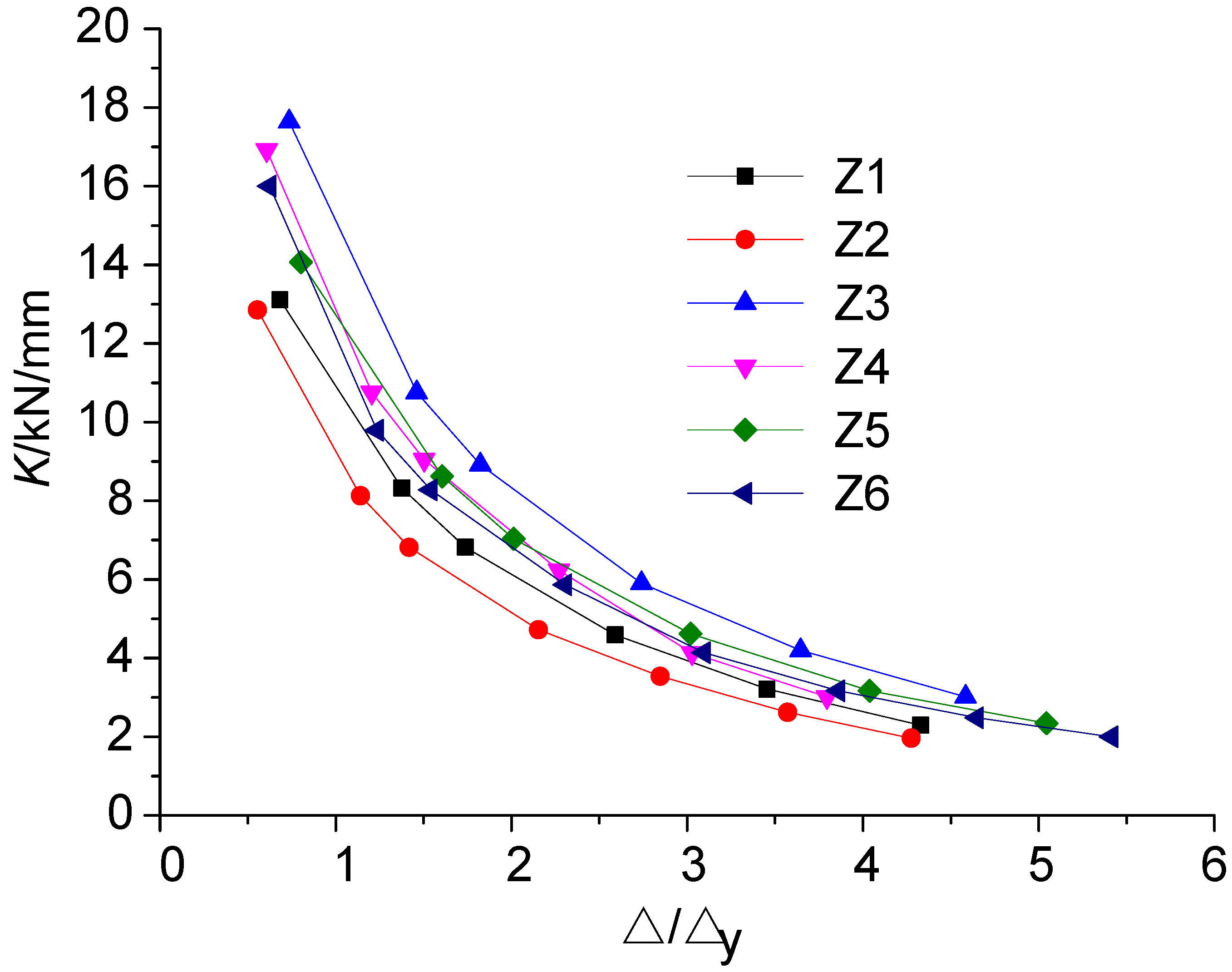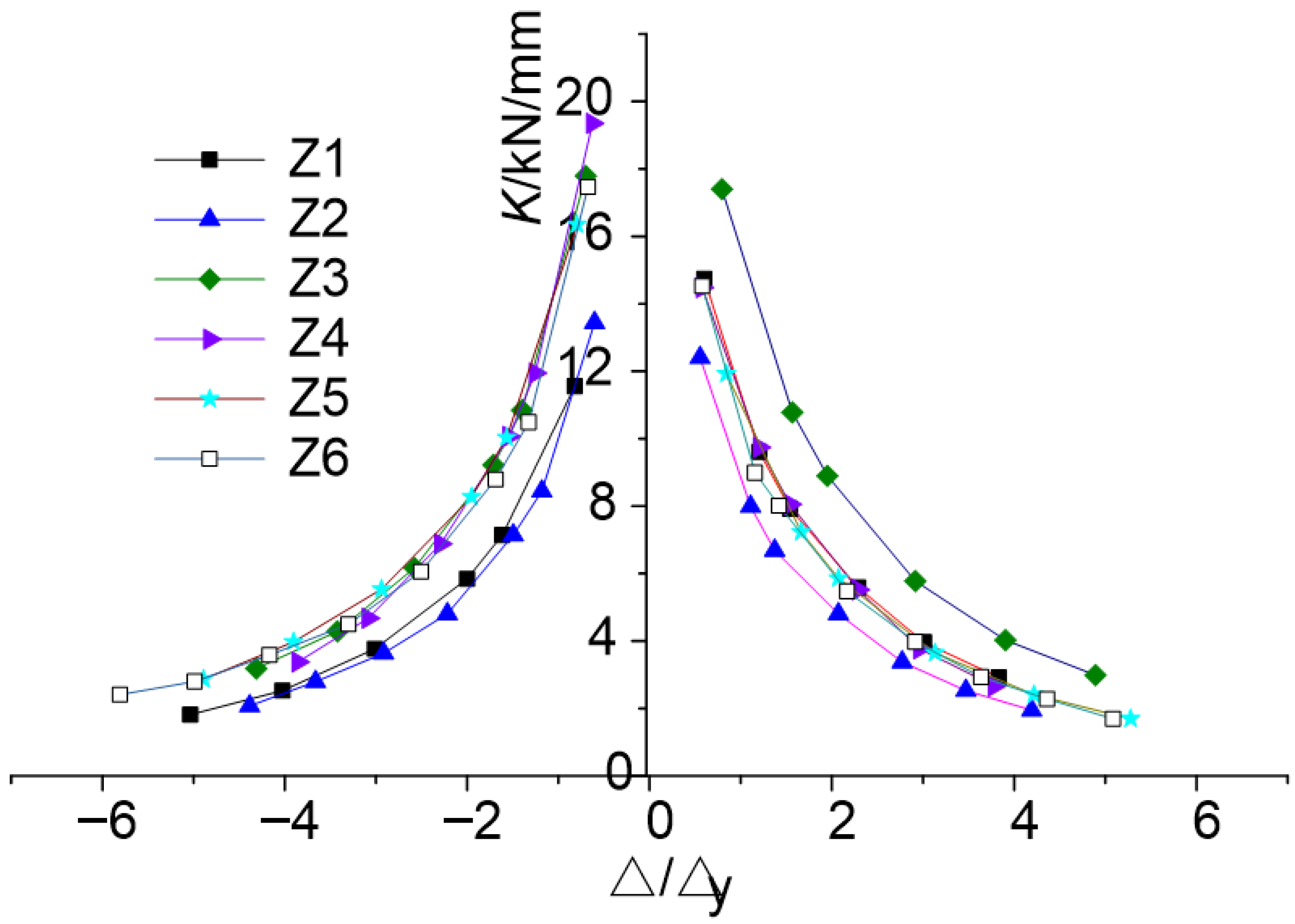K) and average loop stiffness for the three specimen groups as functions of displacement ductility. The results indicate that both the stirrup ratio and concrete strength have minimal influence on the stiffness degradation trends. With the exception of specimen Z4, the stiffness degradation curves of all other specimens exhibit relatively symmetrical behavior in both loading directions with respect to the origin. Notably, specimens that underwent equal strength substitution of stirrups demonstrate a certain degree of stiffness reduction. While the degradation trends of the average loop stiffness curves are consistent across all three specimen groups, the absolute stiffness values differ. Specifically, under identical displacement ductility conditions, specimens with high-strength stirrups exhibit slightly lower average loop stiffness compared with those with ordinary stirrups.