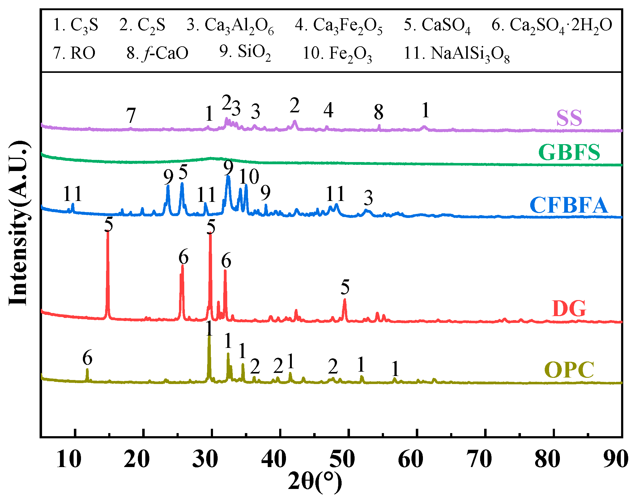 - Ke, G.; Li, Z.; Jiang, H. Study on long-term solidification of all-solid waste cementitious materials based on circulating fluidized bed fly ash, red mud, carbide slag, and fly ash. Constr. Build. Mater. 2024, 427, 136284. [Google Scholar] [CrossRef]