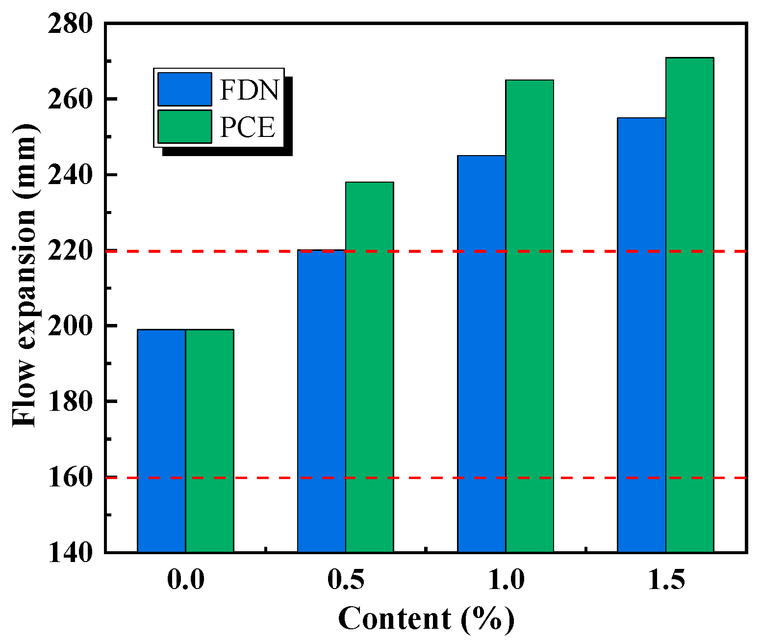 4.1.1. Effect of Water Reducers on the Flow Expansion of MSWC-FSS