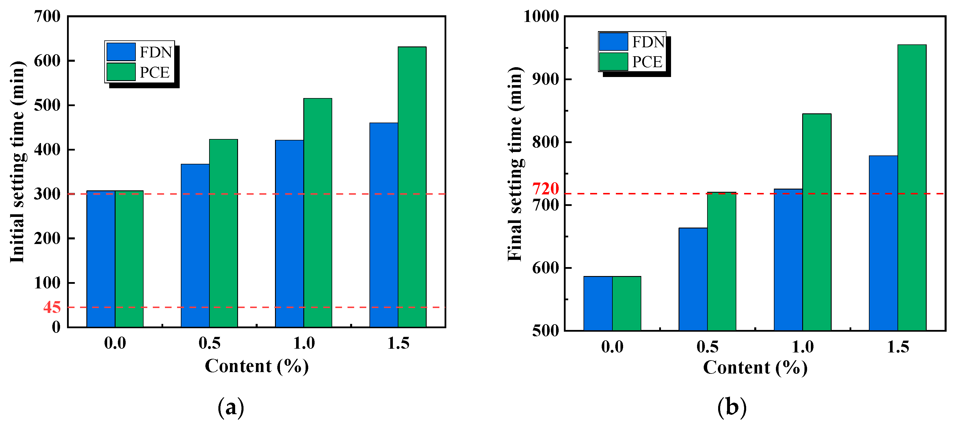 4.1.2. Effect of Water Reducers on the Setting Time of MSWC-FSS