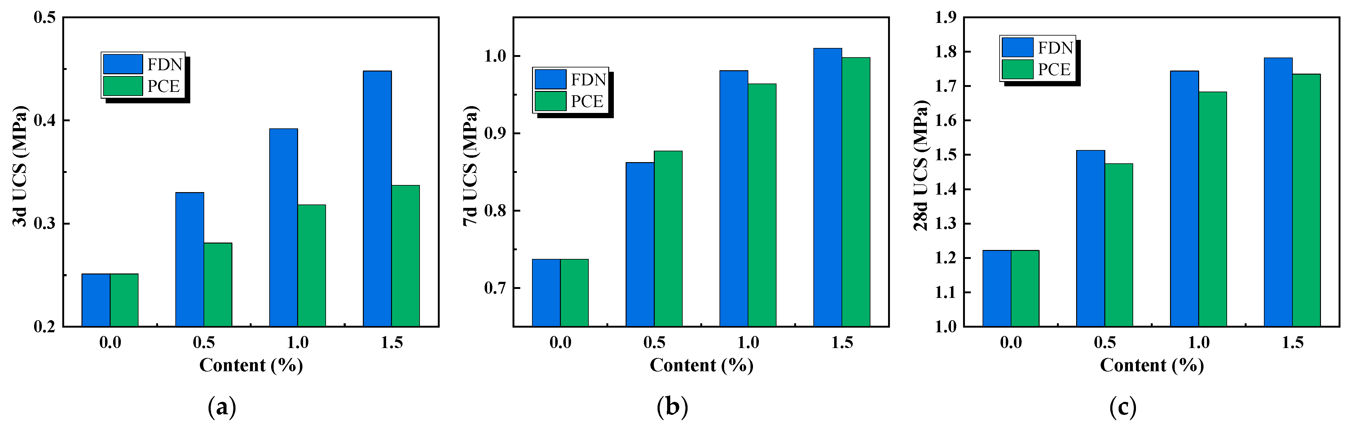 4.1.3. Effect of Water Reducers on the UCS of MSWC-FSS
