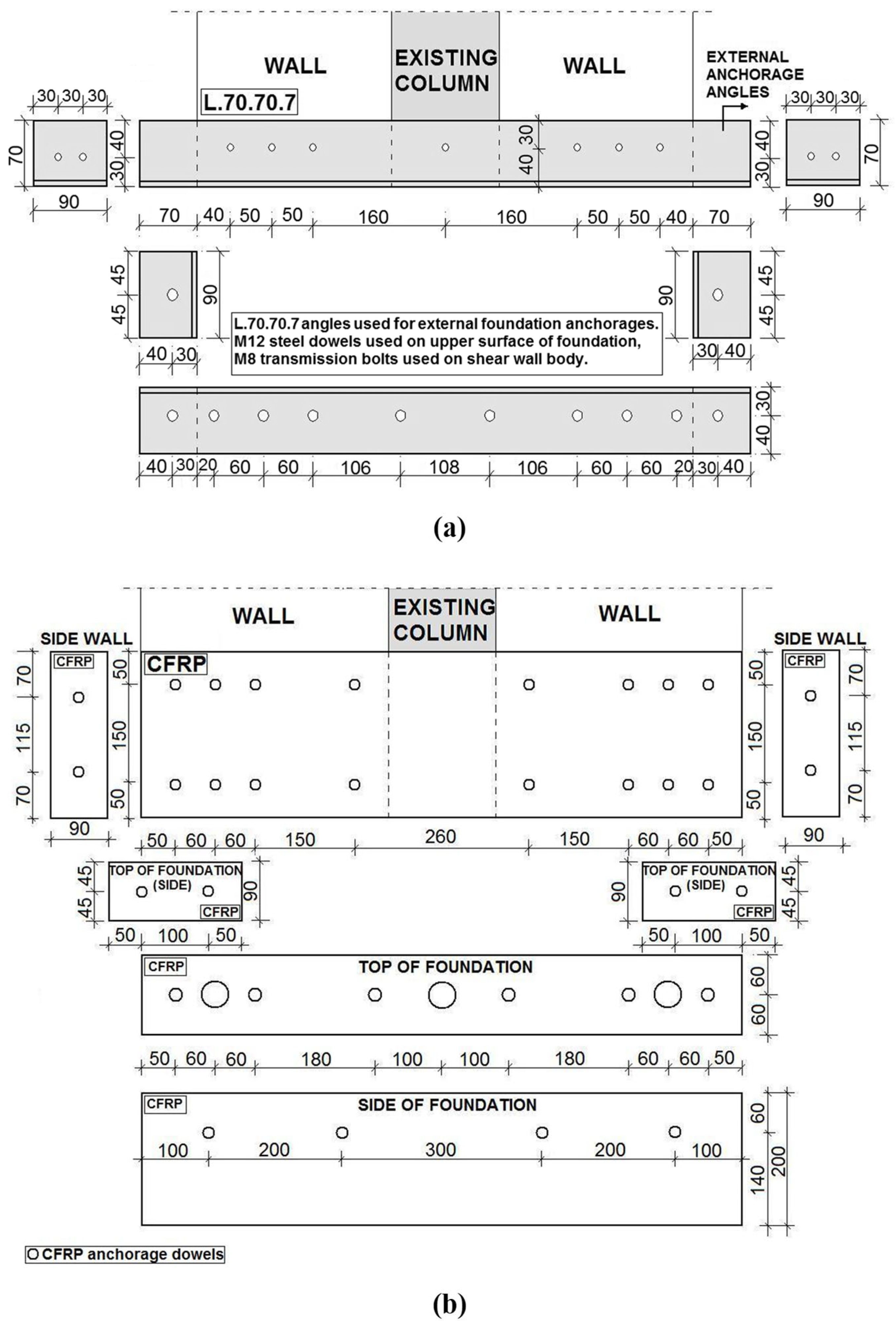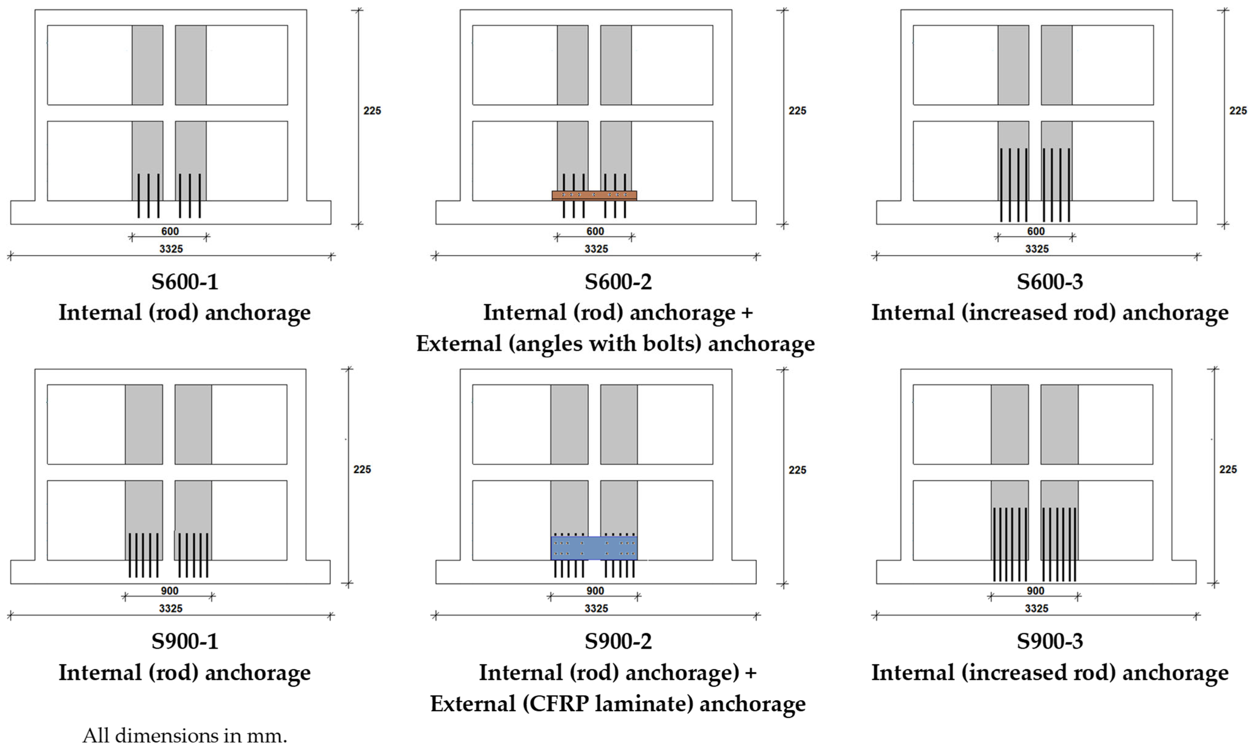 37]. The interval between the anchor bars was 150 mm for all columns and 145 mm for all beams. On the foundation level, the internal anchors in specimens S600-1, S600-2, S900-1, and S900-2 were placed at 70 mm intervals, while the anchors in S600-3 and S900-3 were placed such that one anchor was provided for each vertical reinforcement bar. In S600-1, S600-3, S900-1, and S900-3, only internal anchor bars were used. In the S600-2 test specimen, in addition to internal anchors, an external anchorage was applied using steel with an L70.70.7 angle profile fixed with bolts, fully enclosing the outer edges of the shear wall. In the S900-2 test specimen, external anchorage was also applied in addition to internal anchorage by fully enclosing the outer edges of the shear wall using custom wires and carbon-fibre-reinforced polymer (CFRP) bar anchors [