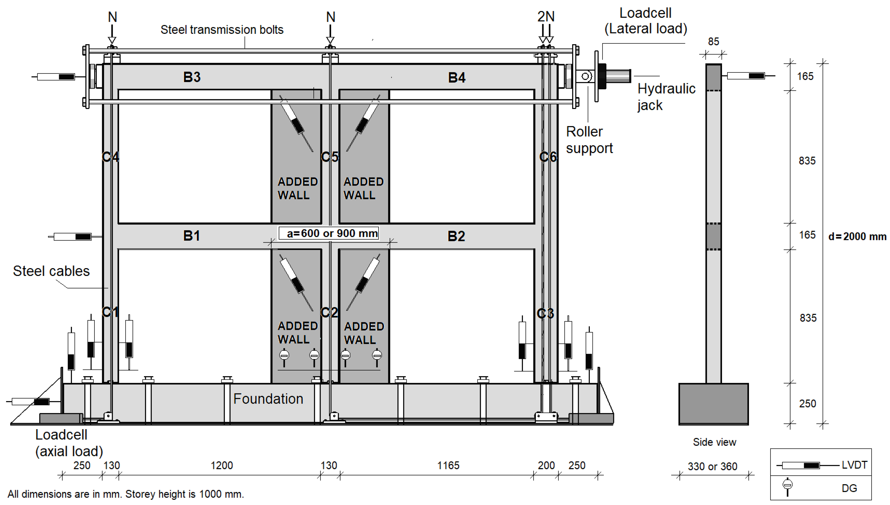 The experiments were conducted on a rigid steel loading frame with a capacity of 250 kN. Quasi-static reversed cyclic lateral loads were implemented at the second-storey beam level in such a way as to transfer the load onto both surfaces of the beam with four transmission bolts fixed on the boundary zones of the specimen. To simulate column behaviour, an axial load of approximately 0.10–0.15 f