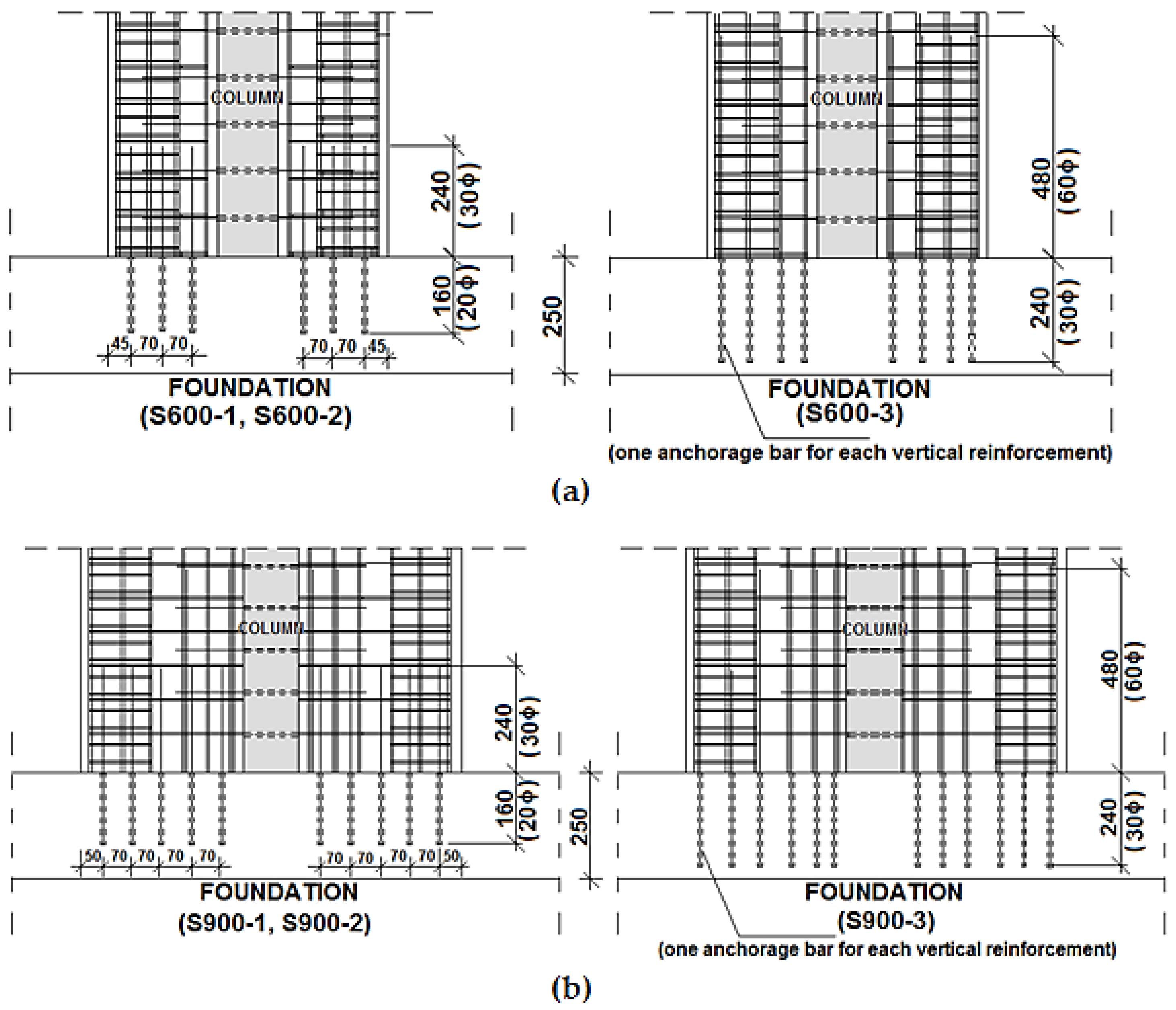 37]. The development length in the foundation anchors was 30 times the reinforcement diameter for specimens S600-1, S600-2, S900-1, and S900-2 and 60 times the reinforcement diameter for specimens S600-3 and S900-3. The internal anchor bars used in the shear wall–foundation joints are shown in