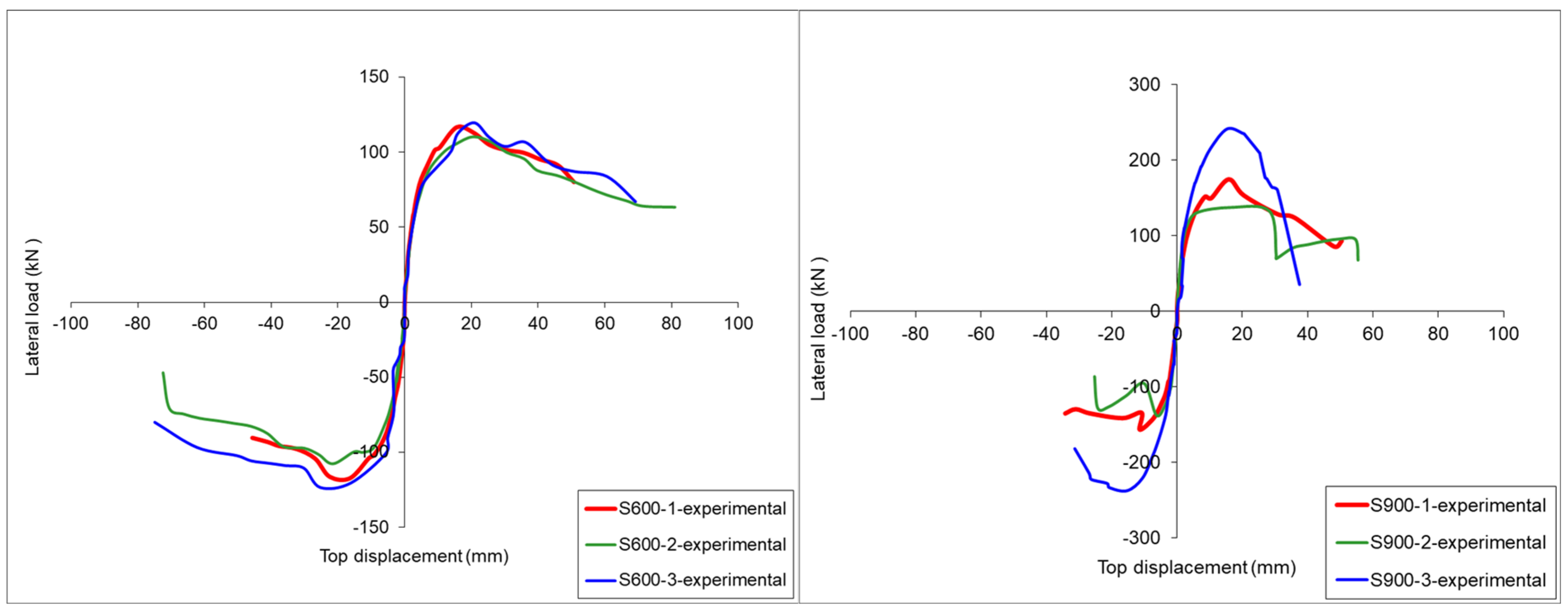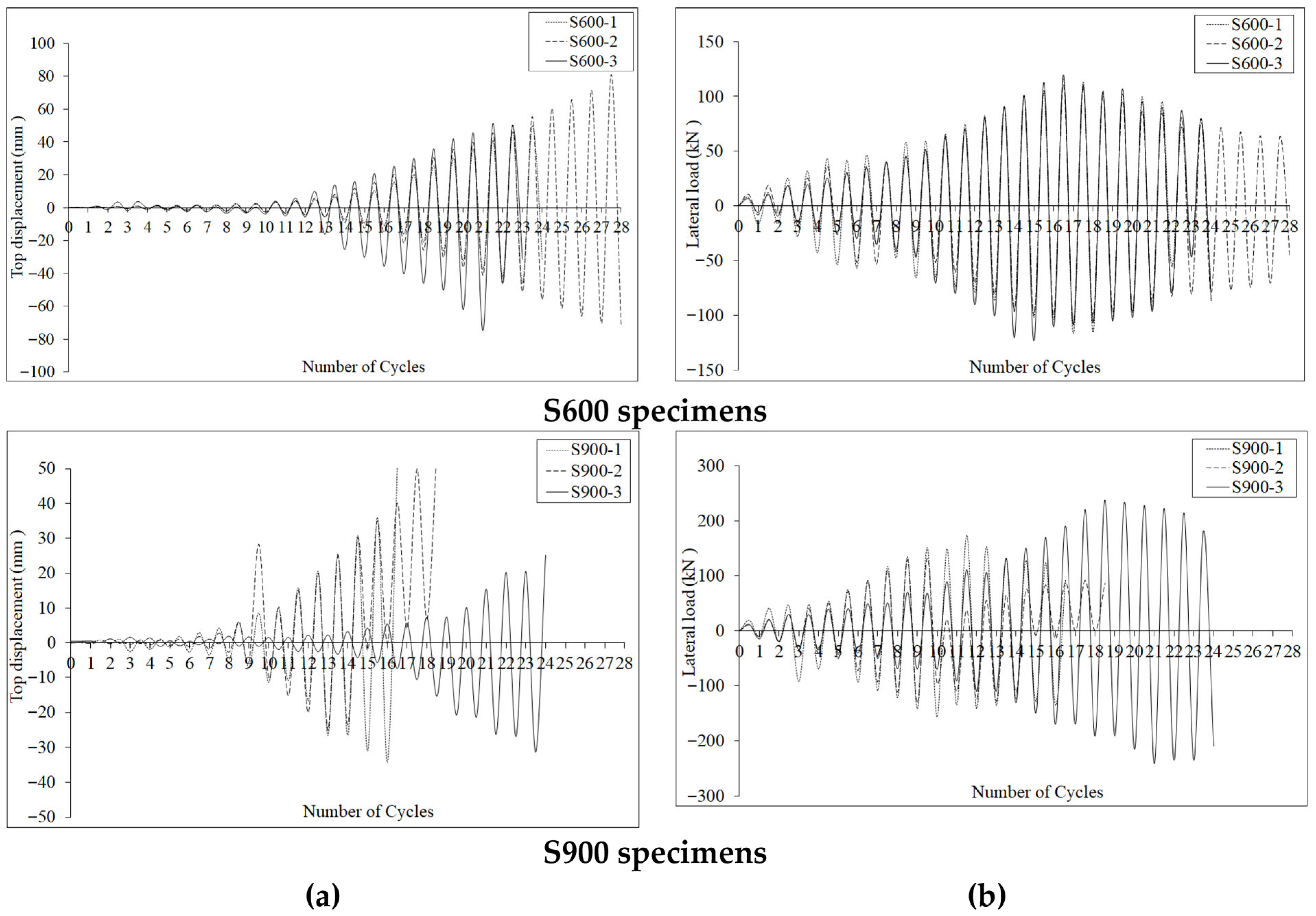 Figure 9 shows that the initial stiffnesses of all the test specimens were similar. In contrast, different envelope curves were observed for the three test specimens. The S900-3 specimen, which had increased internal anchors, exhibited the maximum strength value compared to the other specimens. The most brittle behaviour was observed for the S900-3 specimen.