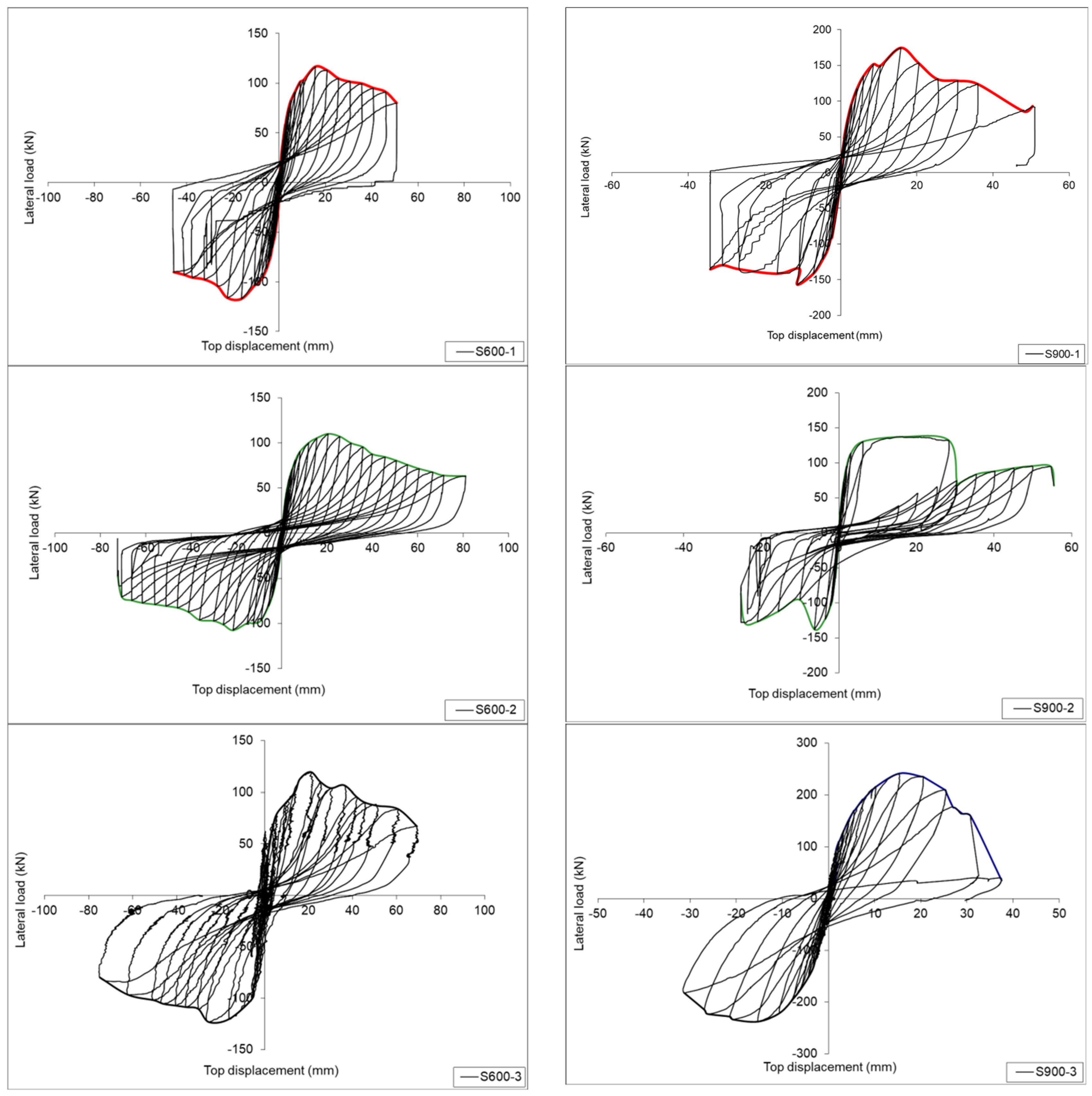 The maximum values were observed for S600-2 and S900-2 with different shear wall lengths in terms of the final lateral top displacement. Accordingly, when considering the forward loading cycles, the specimens with both internal and additional external anchors exhibited increases in the ultimate lateral top displacement of 62% in specimen S600-2 and 9% in specimen S900-2 compared to the first group of specimens that had the same amount of internal anchorage only.