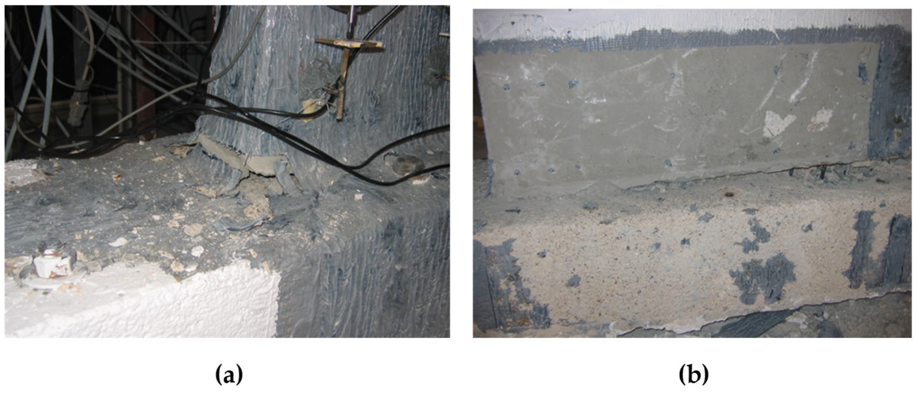 In test specimen S900-2, for which the shear wall–foundation joints were bound with CFRP, no shear cracks were observed at the corner joints at the same lateral displacement level. This was in contrast to specimen S600-2 from the same group, as well as specimen S900-1, which had the same wall length, but only internal anchorage. Thus, for S900-2, the damage level of the frame decreased and the CFRP laminate contributed at least partially to the structural behaviour of the specimen. When the CFRP laminates that were used in S900-2 for additional external anchorage in the shear wall–foundation joint were removed, no damages were observed on the foundation’s surface (