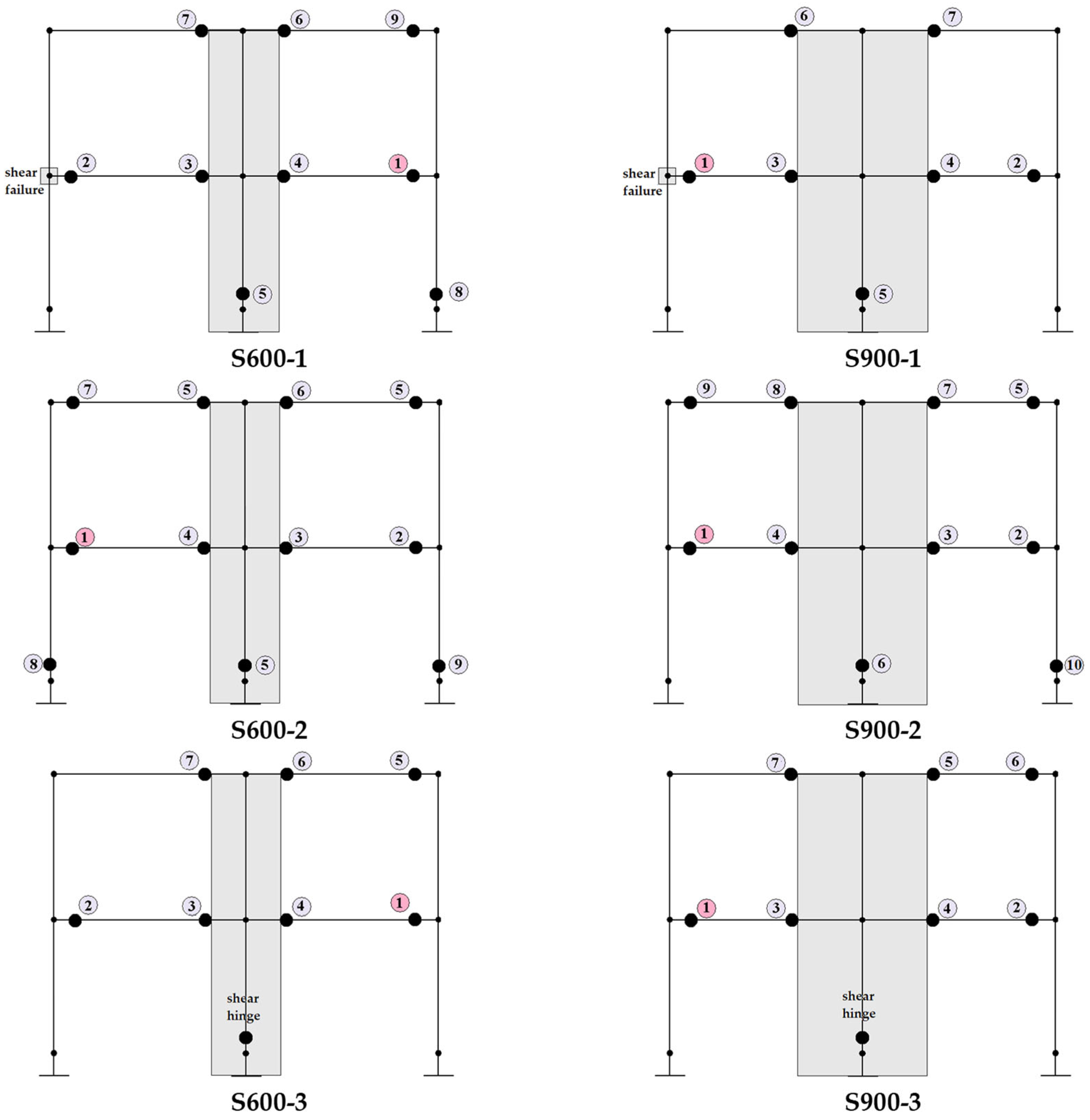 Shear hinge formation occurred at the first-floor left-hand edge nodes of the S600-1 and S900-1 specimens in Group 1, which only had internal anchors. For both specimens, the hinge formed in the fifth row at the rehabilitative wall–foundation connection. Due to the inadequacy of the anchors used, significant damage occurred at the shear wall–foundation joint and shear damage at the left-hand beam–column joint, resulting in collapse. This led to the formation of a relatively small number of plastic hinges and, consequently, a lower energy dissipation capacity. The highest number of hinge formations was observed in the second group for the S600-2 and S900-2 specimens, which had both internal and external anchors. This situation demonstrates that external anchors also contribute to the behaviour of the load-bearing system. In the third group, which contained the S600-3 and S900-3 specimens, shear hinges formed in the rehabilitative wall. In this group of samples, as a result of the anchors at the shear wall–foundation connection being adequate, the shear wall carried most of the lateral load, the damage level in the other structural elements decreased, and the energy was consumed by shear cracks in the shear wall. In all the test specimens, the first four hinge formations occurred at the beam ends on the first floor.