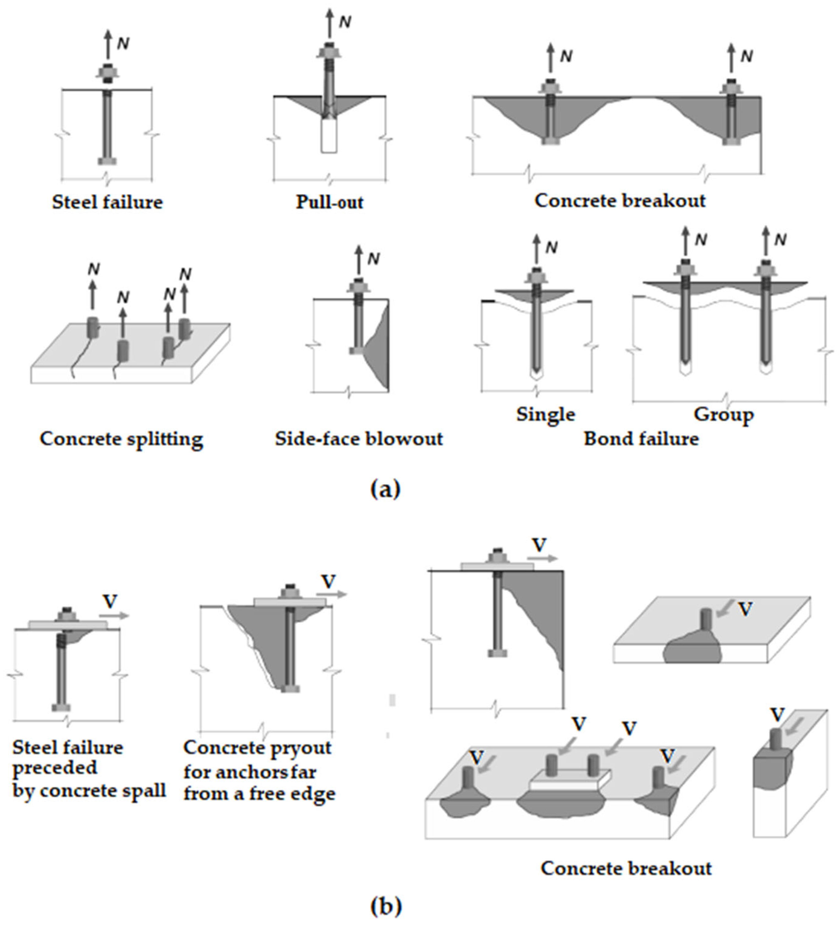 Figure 15 presents the possible concrete anchorage collapse modes that might occur under the tensile and shear loadings given in ACI318-19 [