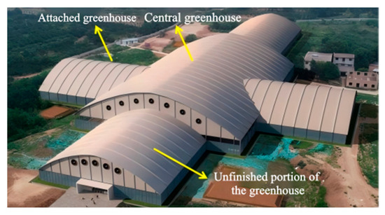 The construction site is illustrated in Figure 2. The aluminum alloy arch beams adopt a double-web H-shaped cross-section. To prevent electrochemical corrosion between dissimilar metals, the concrete-filled steel tube columns are connected to the aluminum alloy arch beams via stainless steel connectors and ring-groove rivets. The stay cables consist of hot-extruded polyethylene (PE)-sheathed steel strands. The struts are made of Q355B round steel bars, with their lower ends anchored to the concrete-filled steel tube columns. A schematic of the single-bay structure is presented in Figure 3, and the corresponding detailed parameters are summarized in Table 1, including the yield Strength, ultimate Strength, modulus of elasticity, Poisson’s ratio, density, and thermal expansion coefficient.